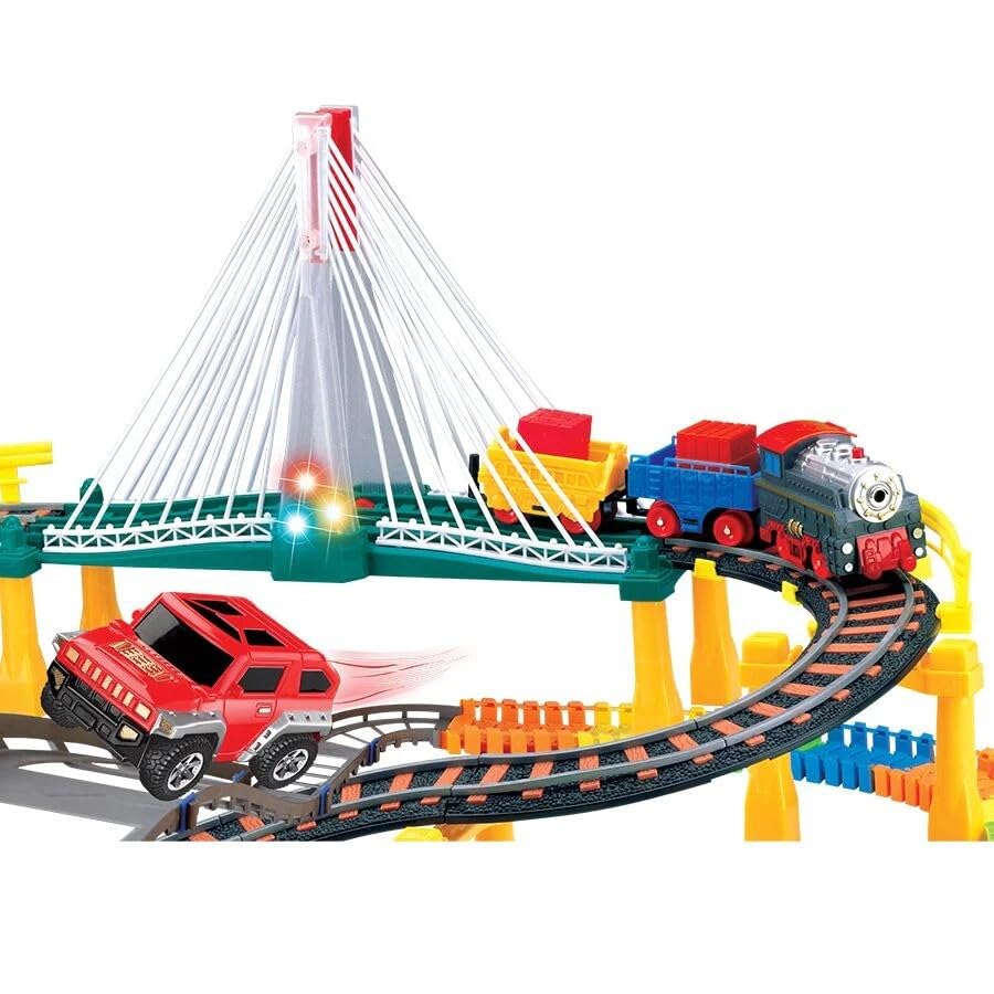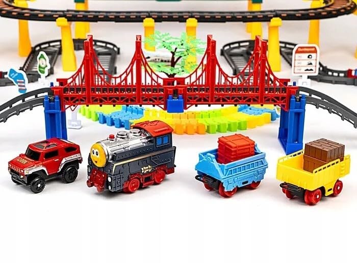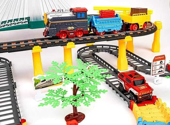 1️⃣ 212 Pieces Complete Railway Track Set This exciting train toy includes 212 pieces of track parts, bridges, train engine, and toy car, allowing kids to build a large and fun railway track layout.