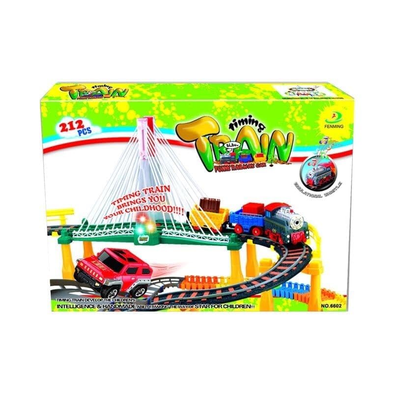 212 PCS Timing Train Railway Track Set. This exciting toy allows children to create their own railway world with multiple track pieces, bridges, and vehicles. Kids can design different track layouts and watch the train travel around the railway while the included toy car adds extra play possibilities. The DIY assembly feature makes this toy both fun and educational, helping children develop creativity, imagination, and problem-solving skills. The train set is made from durable and child-safe materials, ensuring safe playtime for young children. Building and connecting the tracks also helps improve hand-eye coordination and fine motor skills.