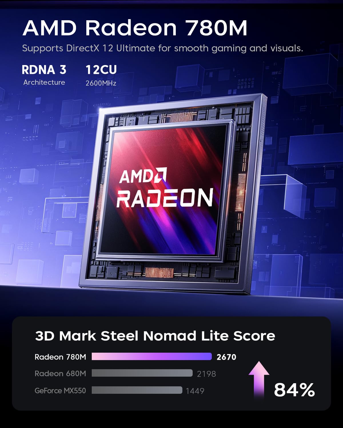 【AMD Radeon 780M GPU】A big novelty is the integrated GPU Radeon 780M, offers 12 CUs. This ensures that all modern games will run on ACEMAGICIAN computers. The AMD Radeon 780M delivers almost 8x the frame rate of the previous Vega 2 chip in most games. Compared to the Iris Xe chip in the 12th and 11th gen Intel processors, the Radeon 780M ends up scoring ~55% higher in 3Dmark and Superposition. AMD Radeon 680M is known as “The most powerful core graphics card”, which is comparable to entry-level discrete graphics cards!