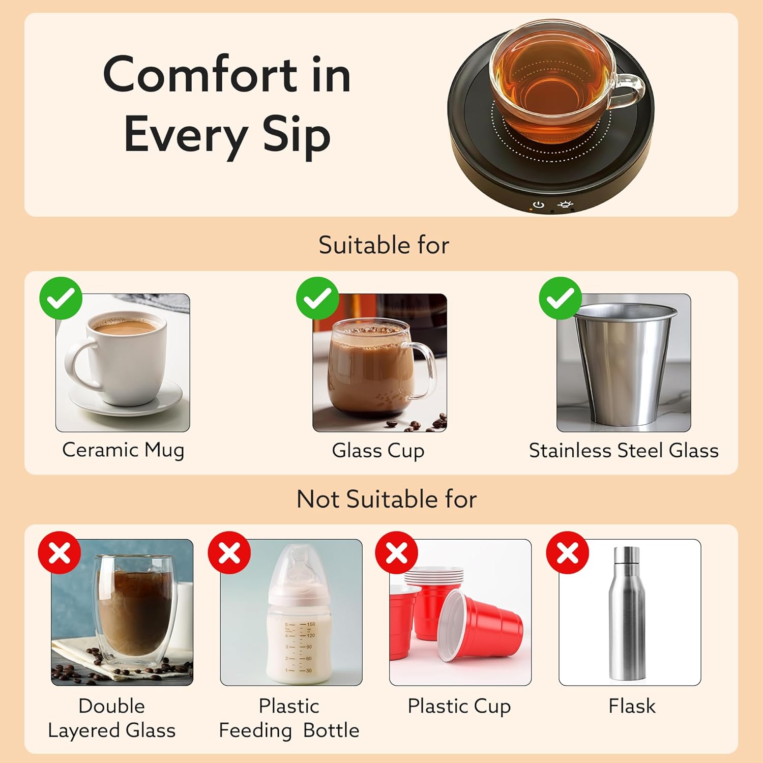 Plug-and-Play Convenience: No installation, switches, or complications. Just plug in, place your flat-bottomed mug or cup on the heating pad, and enjoy. Compatible with most ceramic, glass, or steel cups—ideal for anyone who values simplicity and comfort.