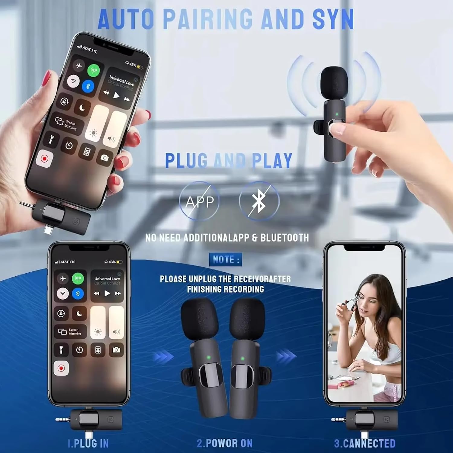 Just plug the receiver into your device, and the lapel microphone will AUTO-MATCHING at once, then you can start taking video or recording. If it’s paired successfully but recording is failed , please try to re-plug the receiver)