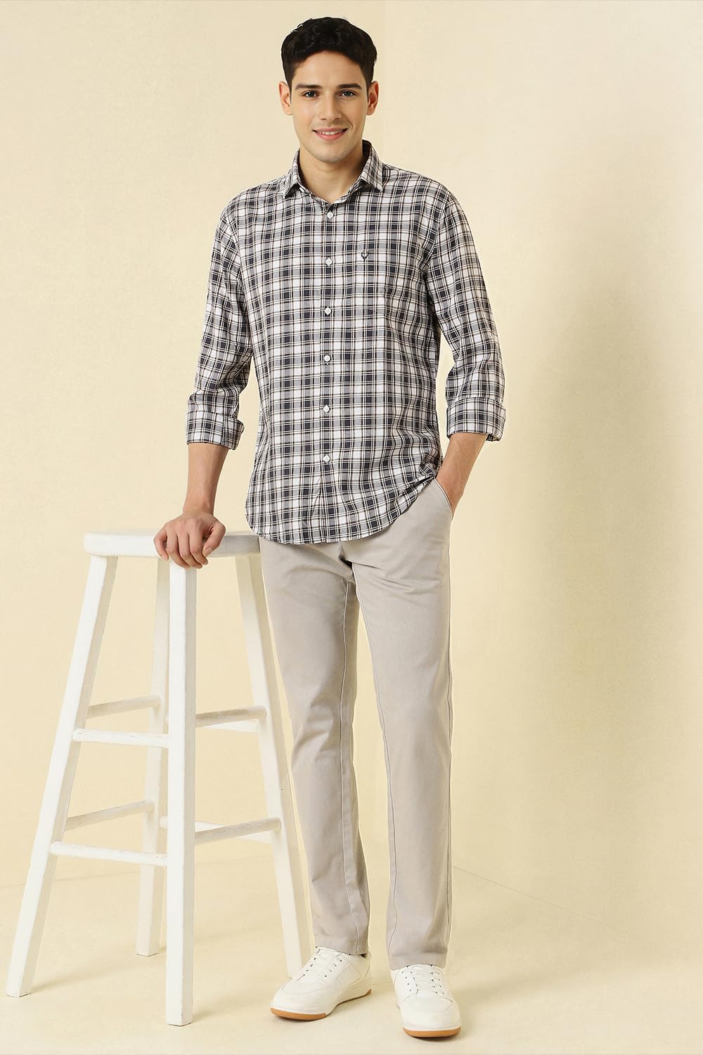 Elevate your casual wardrobe with this Allen Solly check shirt in white. Tailored from comfortable cotton, it seamlessly blends style and comfort, making it ideal for relaxed outings or gatherings. The distinct check pattern adds a touch of sophistication, ensuring you stand out effortlessly. Embrace a look that effortlessly balances casual elegance while enjoying all-day comfort in this must-have piece.