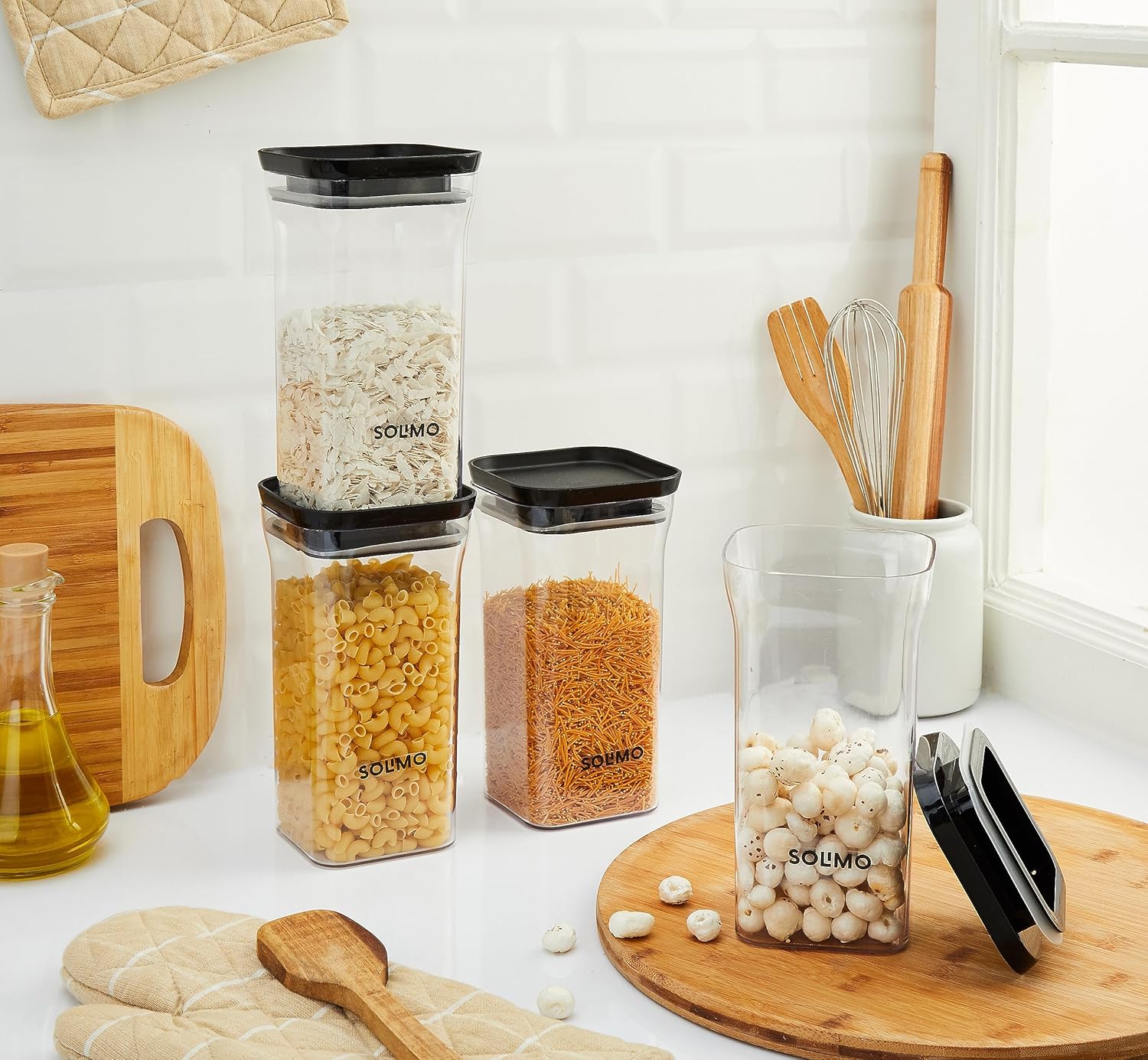 Amazon Brand – Solimo Plastic Storage Jar and Container Set I Air Tight & BPA Free Containers for Kitchen Storage Set I Grocery Kitchen Container Set I Multipurpose Jar, 1100 Ml Each, Set 4, Black