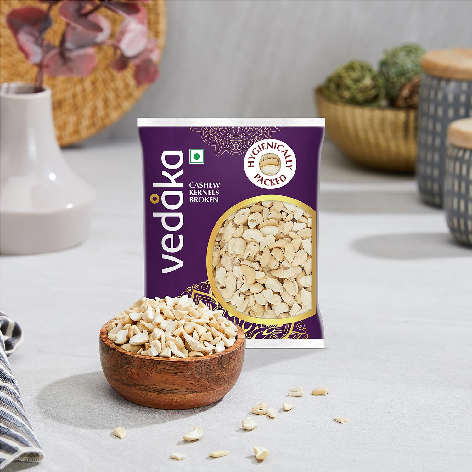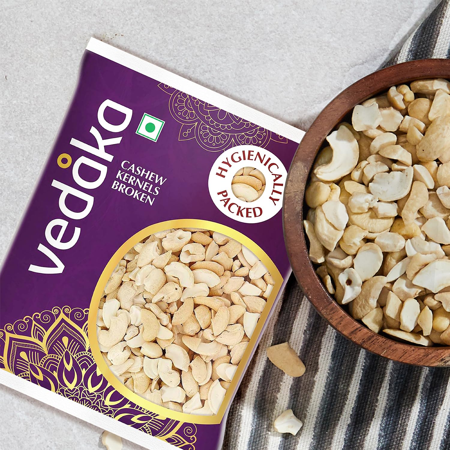Vedaka brings to you high-quality, crunchy broken cashews. Our cashews have a nutty flavour with a firm texture for a rich delicious taste. They are packed in a food-safe pouch which helps retain maximum freshness when you open the pack for the first time. These cashews are packed in an integrated nuts and dried fruits unit and may contain occasional traces of other nuts and dried fruits. Allergy caution: contains tree nuts. Store in a cool, dry place in an airtight container and preferably refrigerate after opening.