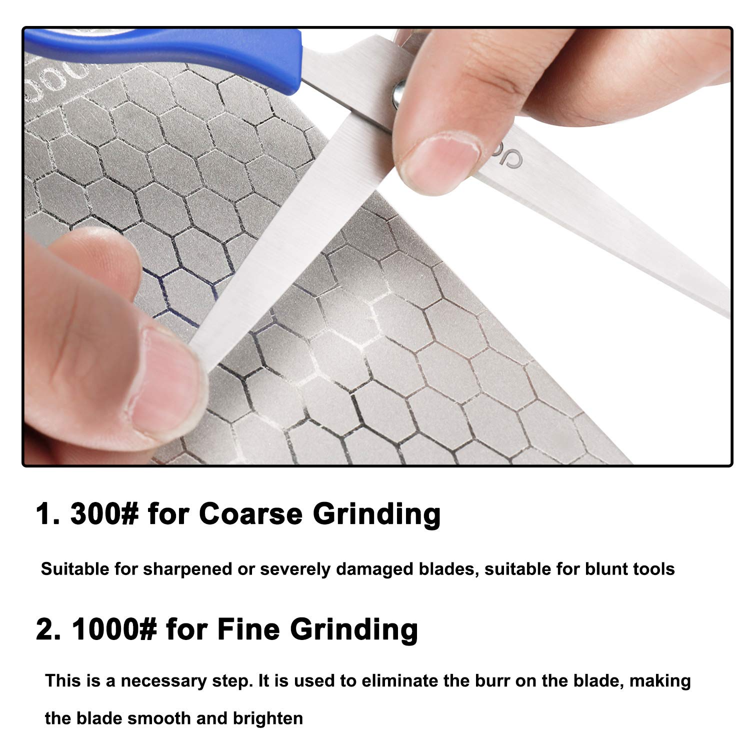 【Double-Sided Design】The sharpening stone is separately imprint with 1000# and 300#, representing coarse grinding for 300# and fine grinding for 1000# Grit. size clearly marked on surface.