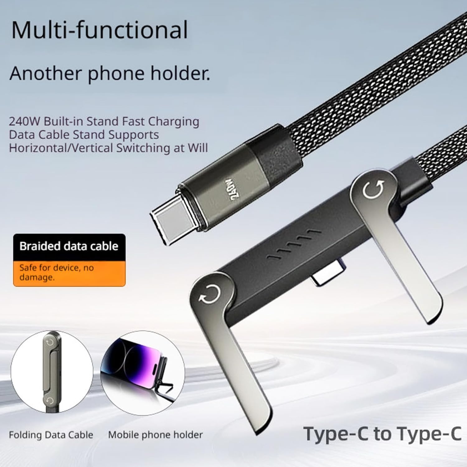 Built-in Folding Stand – Unique Design This type c cable with stand comes with a smart folding stand. You can place your phone easily and enjoy hands-free video watching, video calls, and browsing. Perfect for desk use and daily convenience.