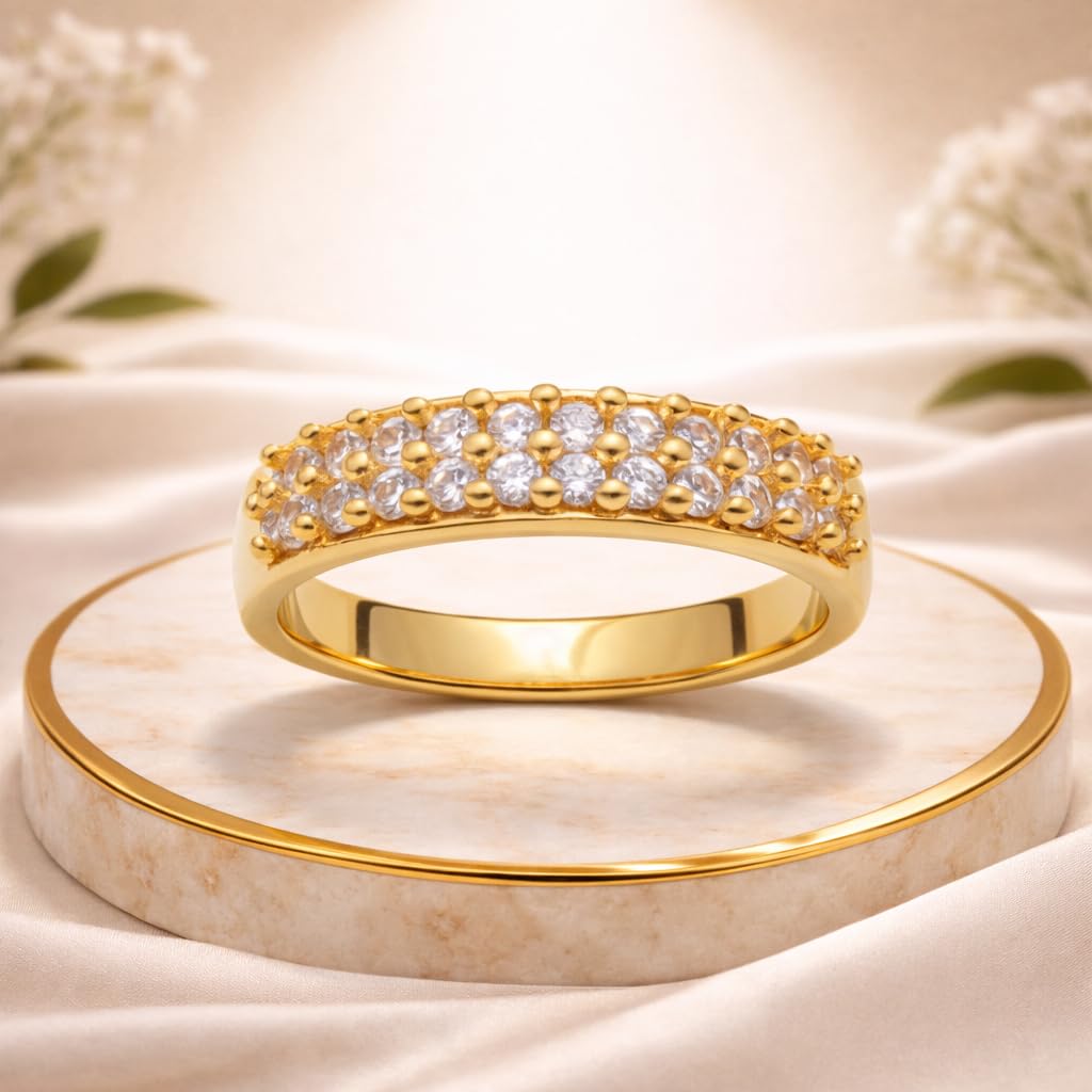 AVIRRA CZ Stone Gold Finish Designer Ring for Women Enhance your style with the elegant AVIRRA CZ Designer Finger Ring, crafted with a premium gold finish and beautifully studded with sparkling Cubic Zirconia (CZ) stones. The ring features a graceful curved band design with multiple shimmering stones that create a luxurious and eye-catching look. This ring is made with gold-filled jewellery technology, featuring a 24K gold thick layer representing approximately 10.50% of the total ring weight, giving it a rich gold-like shine and improved durability compared to ordinary plated jewellery. With a total weight of 1.96 grams and ring size 19, the ring offers a comfortable fit while maintaining a stylish and sophisticated appearance. Its timeless design makes it perfect for daily wear, parties, weddings, festivals, and special occasions. Designed for women and girls who appreciate elegant fashion jewellery, this piece adds a refined sparkle to any outfit and makes a wonderful gift for birthdays, anniversaries, or celebrations.
