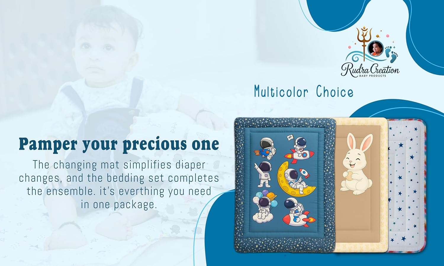DESIGN THEME: Charming space-themed baby bedding featuring adorable astronaut characters, rockets, and moon designs on a soothing blue background with starry border