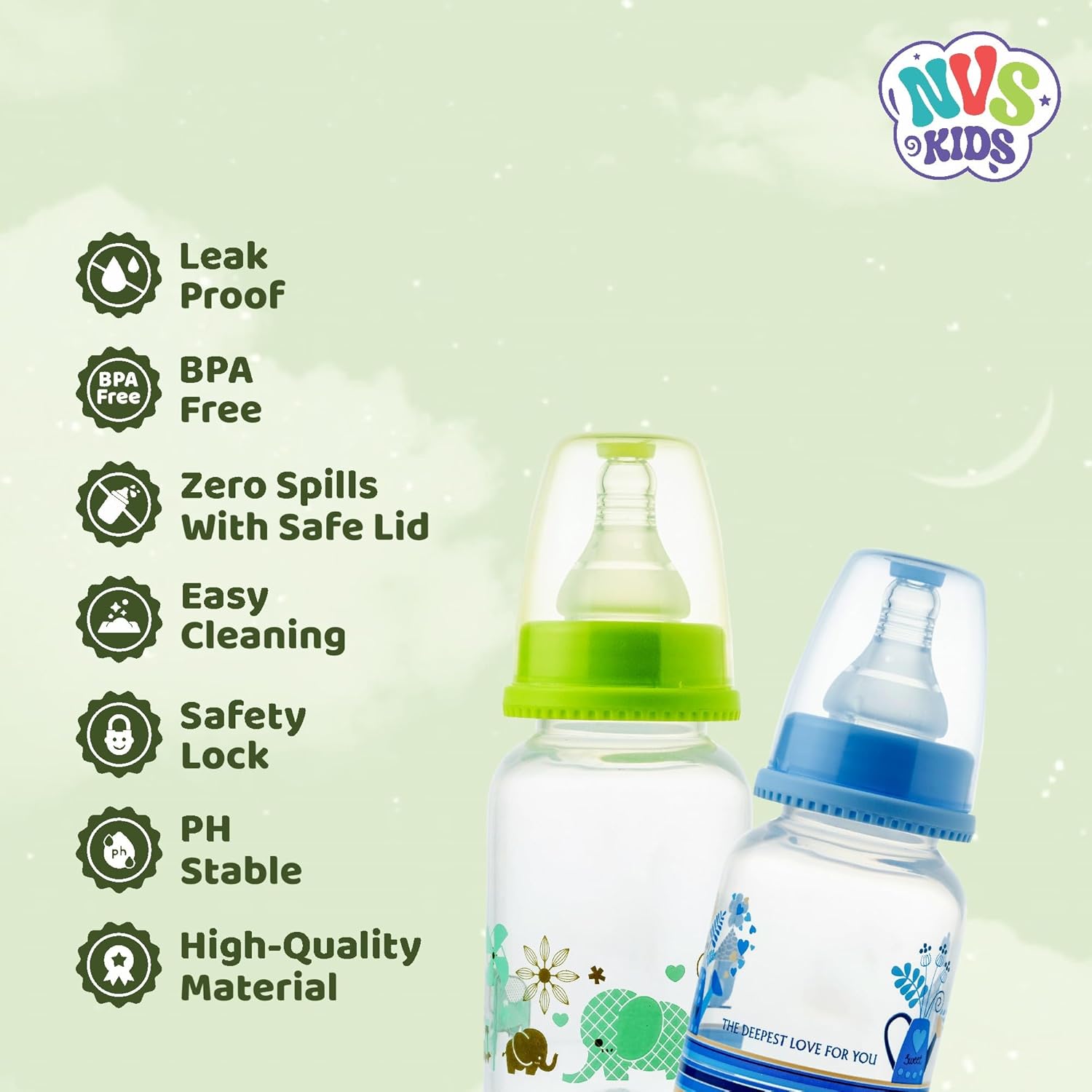 The NVS KIDS Baby Feeding Bottle is designed to provide a safe, hygienic, and spill-free feeding experience for newborns, infants, and toddlers up to 3 years. This 120ml baby bottle features a leak-proof and anti-spill design, preventing unwanted messes while feeding or carrying it on the go. The soft silicone spout mimics a natural breastfeeding feel, making it easier for babies to transition from breast to bottle. Made from BPA-free, non-toxic materials, this feeding bottle ensures your baby’s safety and health. The dust-free cover keeps the nipple clean and hygienic, protecting it from germs and contaminants when not in use. Its lightweight, ergonomic design allows both parents and babies to grip the bottle comfortably, making feeding time stress-free. This baby bottle with a soft silicone spout is anti-colic, easy to clean, and highly durable, ensuring a smooth feeding experience. The heat-resistant material allows it to be sterilizer-friendly and dishwasher-safe, making maintenance effortless for parents. Whether used for formula feeding or breast milk storage, this bottle keeps liquids secure and fresh. Its securely sealed design prevents leaks, making it perfect for travel. Ideal for those looking for a BPA-free feeding bottle, newborn baby bottle, or spill-proof milk bottle, this product is the perfect choice. Upgrade your baby’s feeding routine with a safe, high-quality, and durable baby bottle that ensures convenience, hygiene, and comfort.
