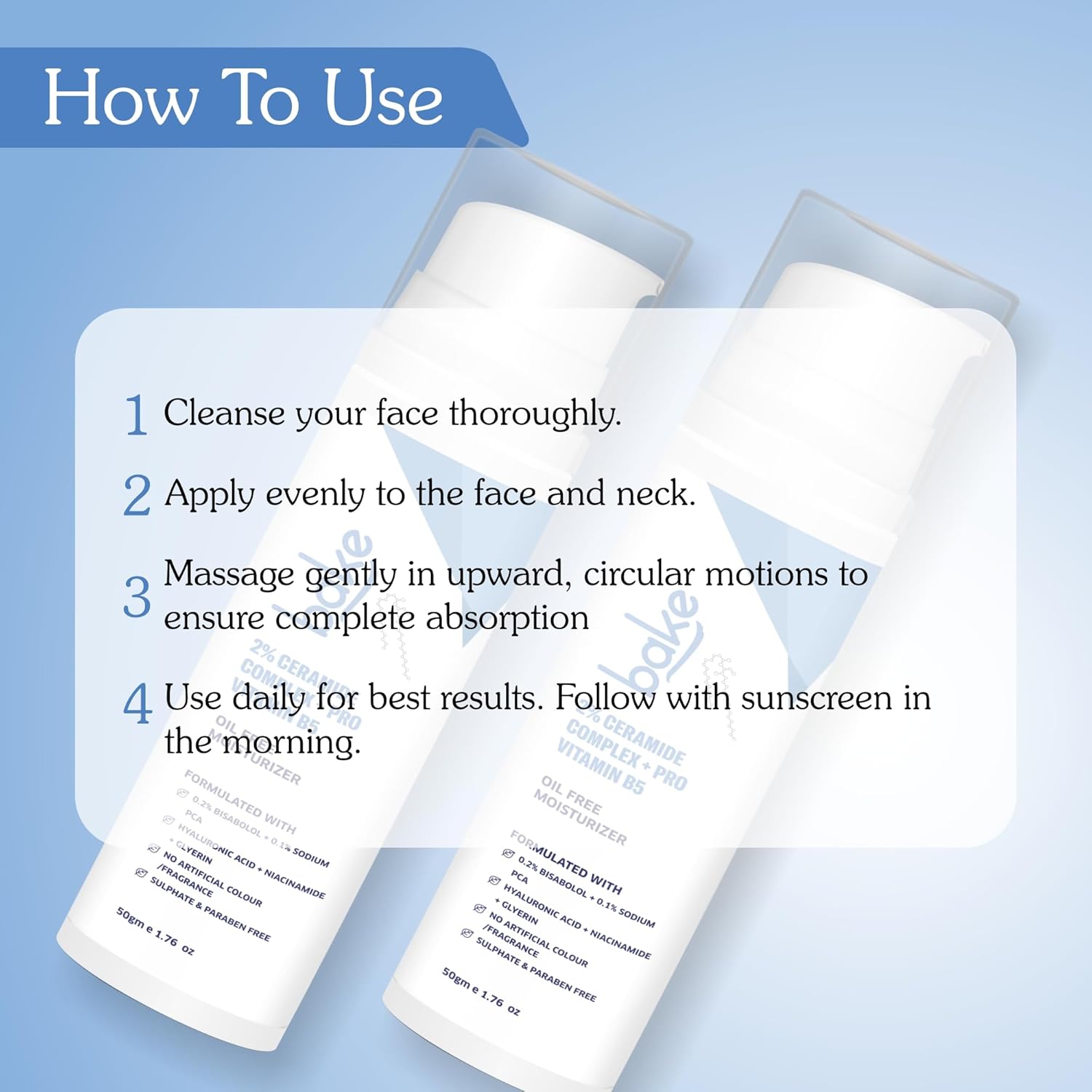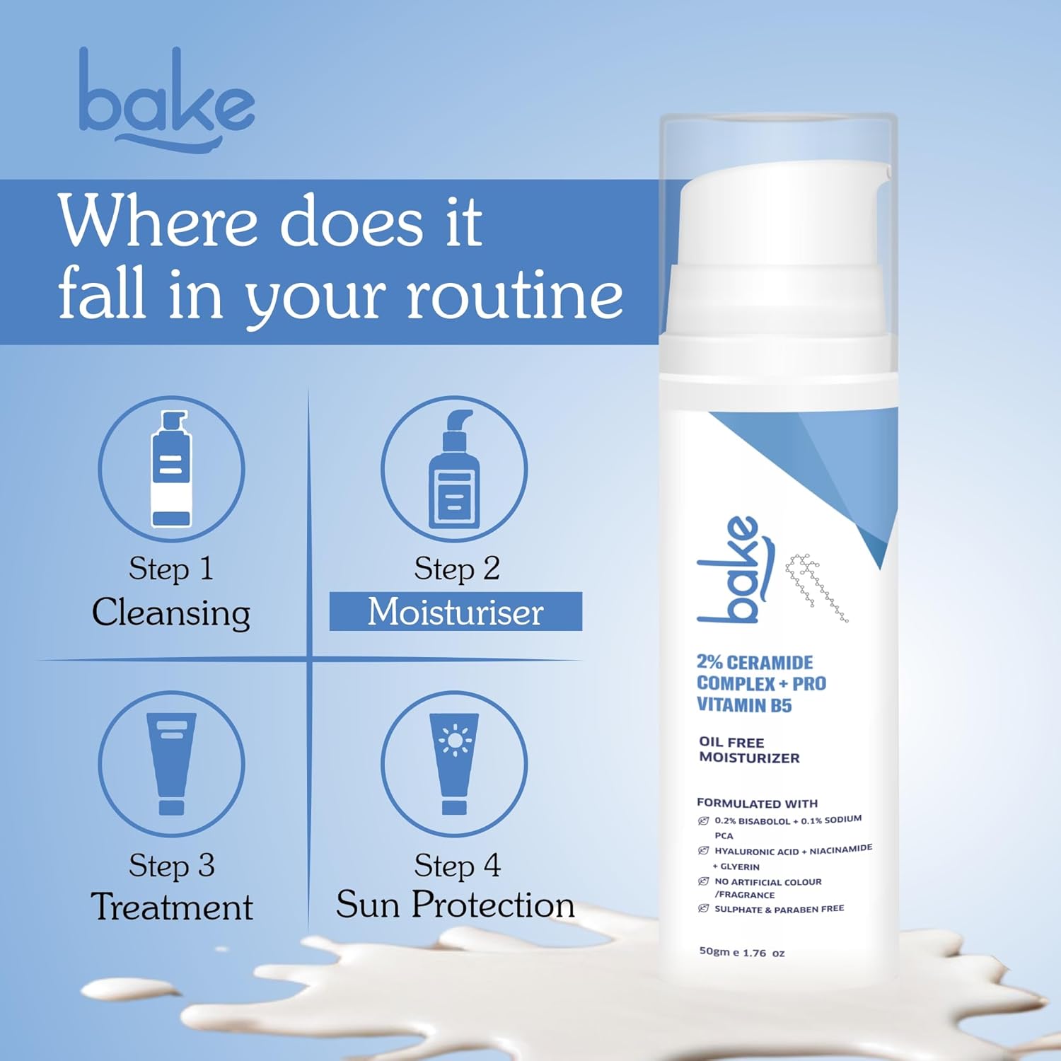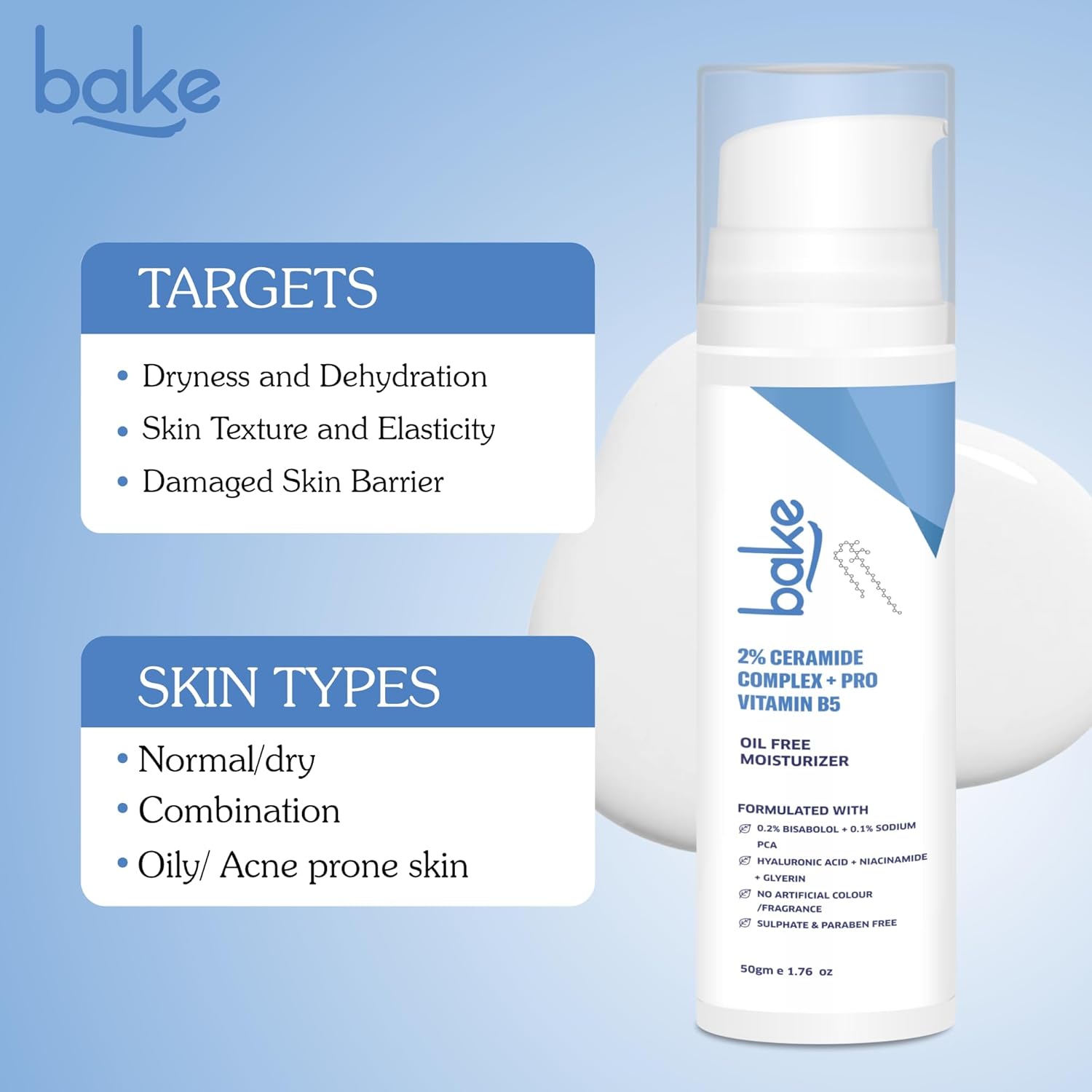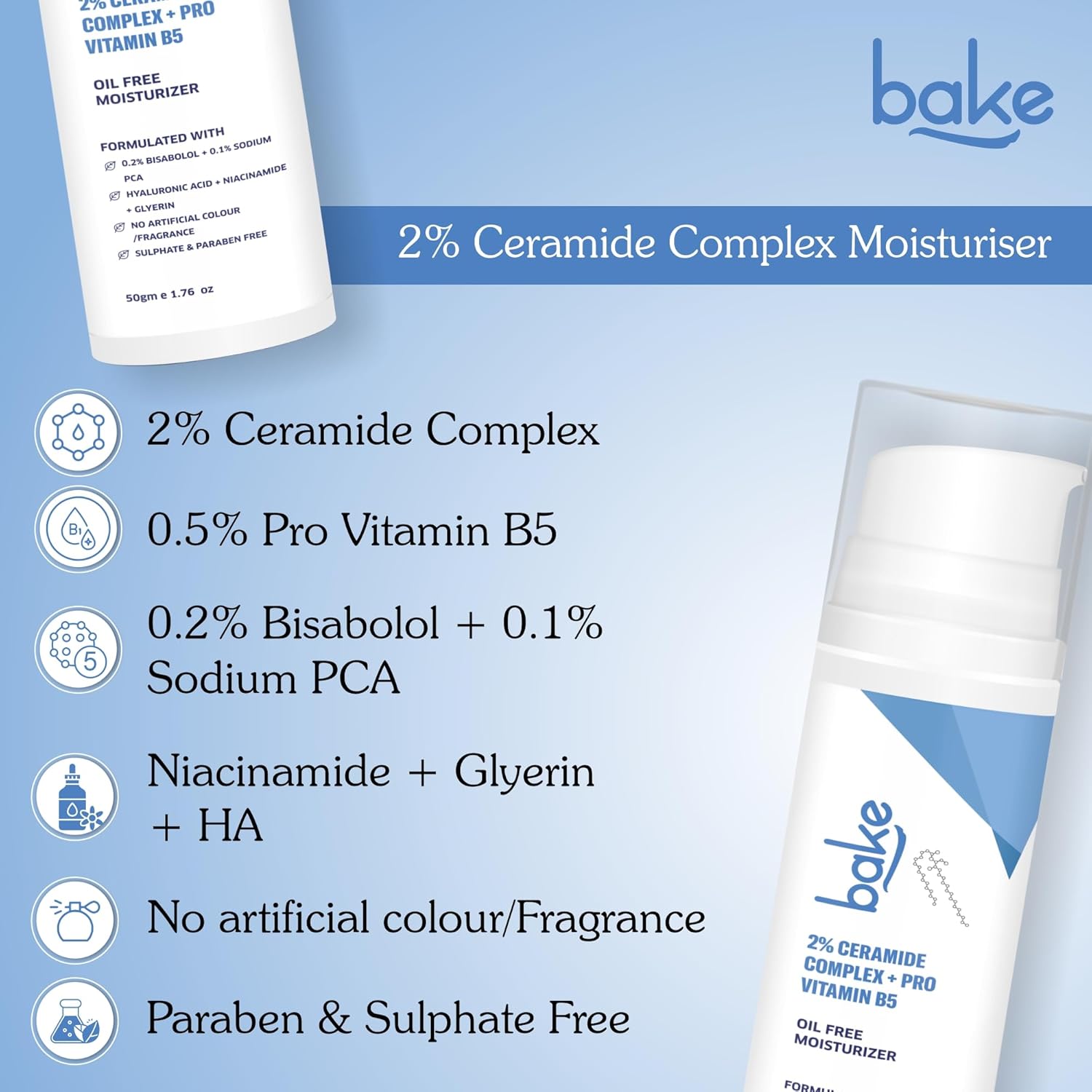 BAKE 2% Ceramide Complex Oil Free Moisturizer with Pro Vitamin B5, 0.2% Bisabolol, Niacinamide for Barrier Repair & Strengthening | Non Comedogenic, For Oily, Normal & Sensitive Skin – 50g (50 g, 2% Ceramide Moisturizer)