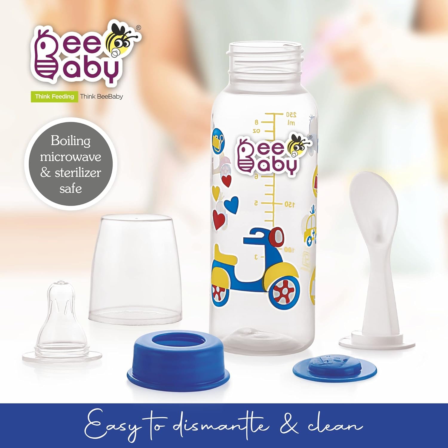 BeeBaby 2 in 1 Gentle Slim Neck Baby Feeding Bottle with Anti – Colic Gentle Touch Silicone Nipple and Feeder Spoon (Plastic) for New Born / Infant / Toddler / Babies, 100% BPA FREE, 8 Months + (250 ML / 8 oz.) (Blue) (Pack of 2)
