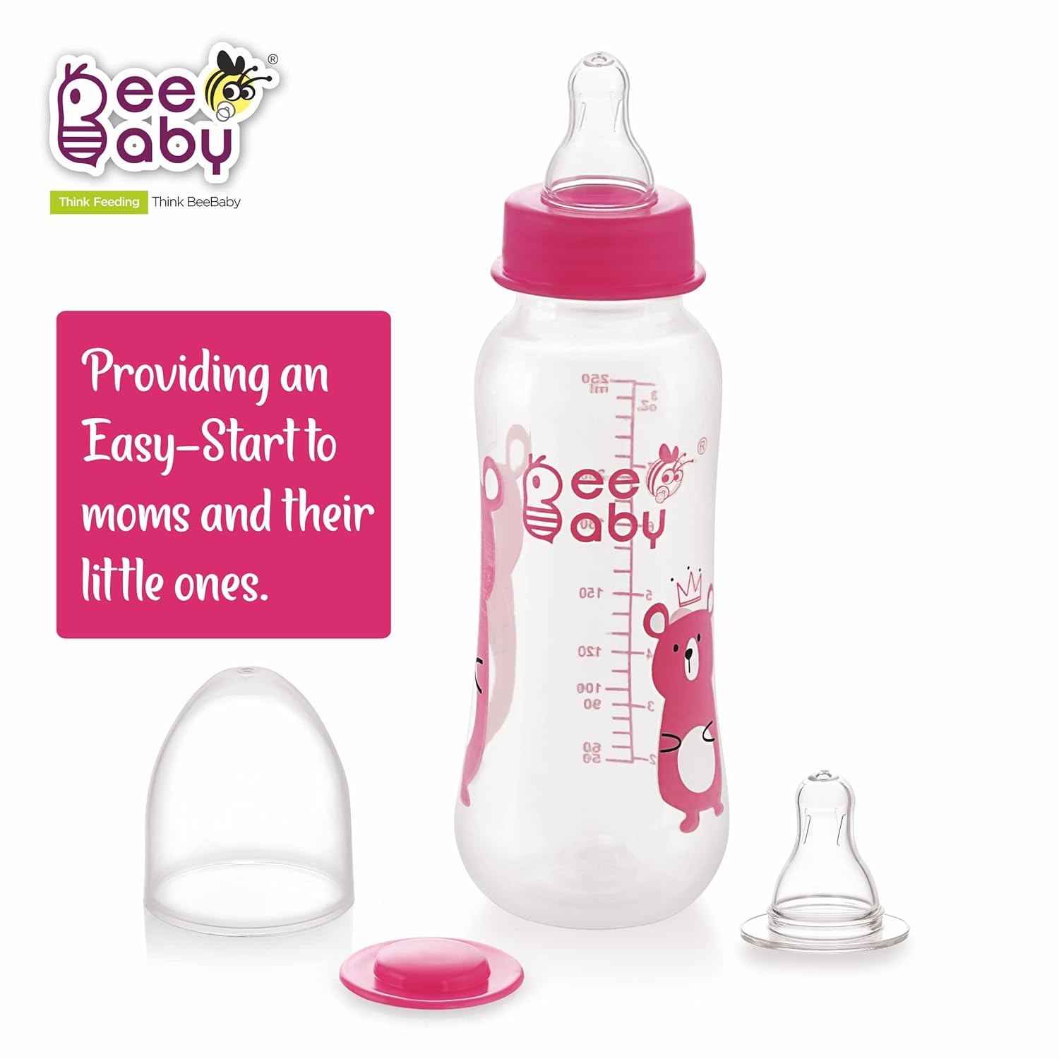 BeeBaby Easy Start Slim Neck Baby Feeding Bottle with 2 Anti-Colic Gentle Touch Silicone Nipples for New Born, Infant, Toddler, Babies, 100% BPA Free, 8 Months + (250 ML, Pink, Pack of 1)