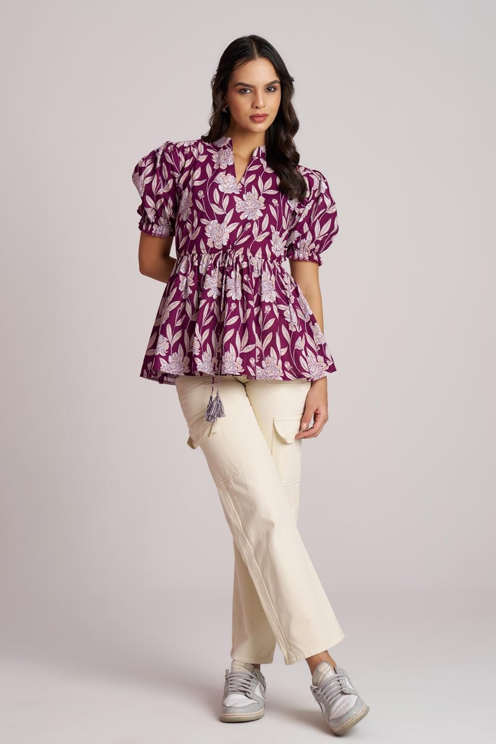 BERRY BIRD Floral Print Mandarin Collar Puff Sleeve Cotton Peplum Top