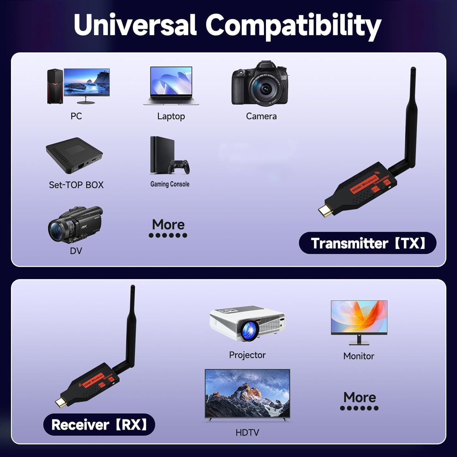 Dual-Antenna Design, Long-Range, No-Lag, and Strong Compatibility- This wireless HDMI transmitter and receiver with dual-antenna design offers a transmission distance of up to 330 feet/100 meters. It features a built-in high-performance chip for enhanced compatibility, utilizing both 2.4G and 5G dual-band transmission protocols. This ensures strong anti-interference capability and high signal stability, eliminating issues like flickering, black screens, and delays. (Note: Transmission distance may be shortened when facing obstacles like walls, floors, and ceilings. Closed spaces between floors may not allow signal transmission.)
