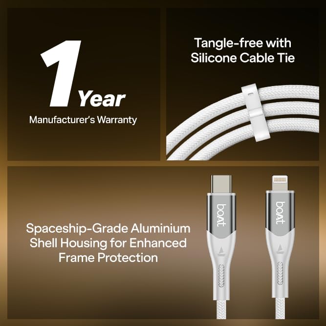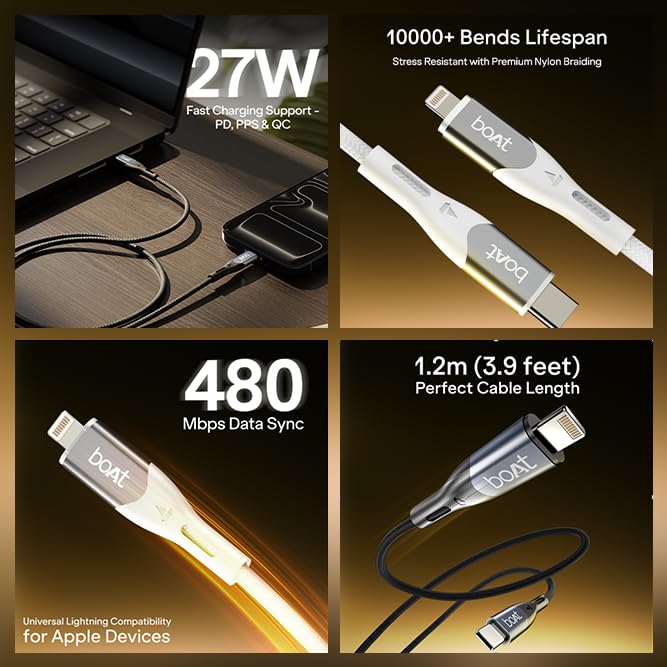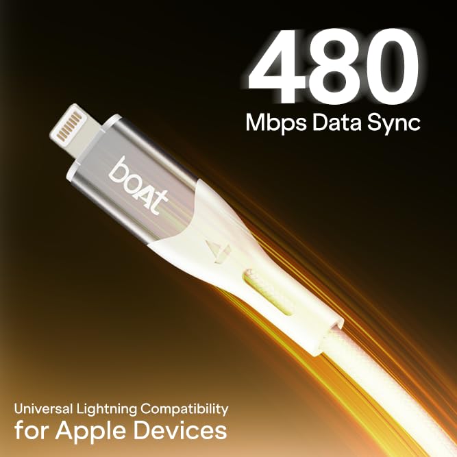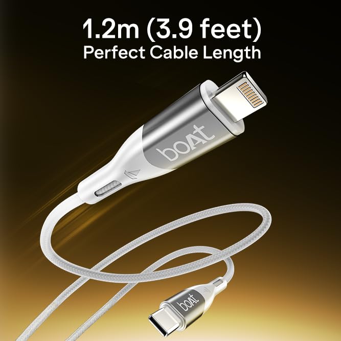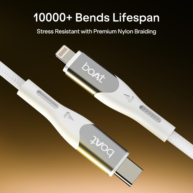 Experience smarter, faster, and more durable charging with the boAt Type-C to Lightning 27W Fast Charging Cable. Built for Apple users, this cable supports 27W ultra-fast charging, allowing your devices to power up quickly while maintaining steady and consistent performance across all Lightning-enabled devices. The 1.2m length offers comfortable reach whether you’re working at a desk, relaxing by the bedside, or plugging into wall switches positioned a little farther away. It’s designed for everyday convenience without being too long or bulky. For everyday syncing, the cable supports reliable 480Mbps data transfer, making routine tasks like transferring photos, videos, and backups smooth and interruption-free. Crafted with a premium nylon braided exterior, the cable feels sturdy and durable in hand, offering added protection against wear and daily use. The flexible braided design keeps the cable tangle-free and easy to manage, and it also comes with a silicone cable tie, so you can neatly wrap, store, or carry it without any clutter. Engineered for longevity, the cable has undergone testing for 10,000+ bends, ensuring it stands strong against repeated twists and bends over time. The connectors are reinforced with spaceship-grade aluminium alloy shells and extended tail protection that safeguard stress points, reduce chances of fraying, and make the cable capable of handling constant plugging and unplugging. Backed by a 1-year manufacturer’s warranty from boAt, trusted by millions of boAtheads, this Type C to Lighting 27W cable brings together fast charging, durable build quality, and everyday ease of use, making it a reliable companion for all your Apple Lightning devices.