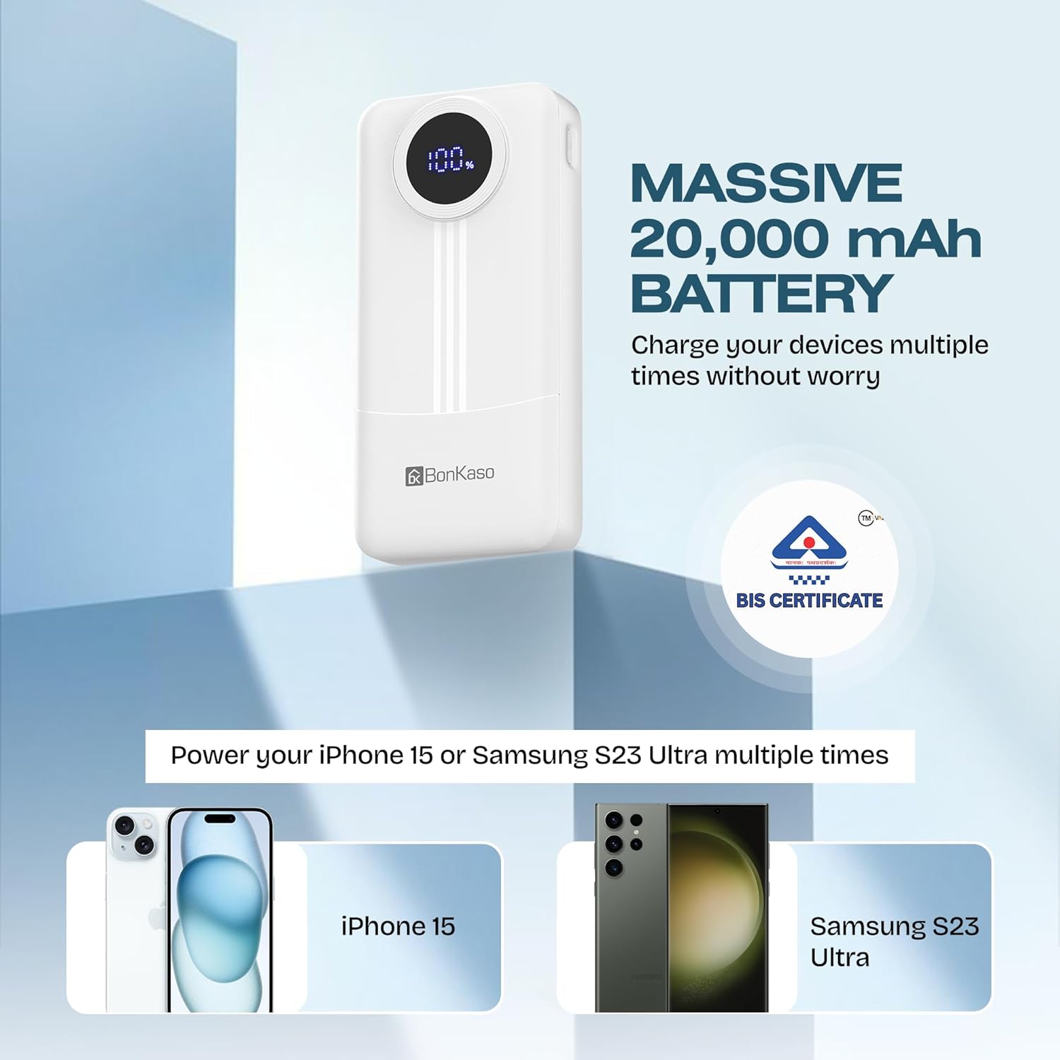 BonKaso 20000mAh Power Bank 22.5W PD Fast Charging with Built-in Type-C Cable, USB-A & Type-C Output, Digital LED Display, Slim Portable Charger for iPhone, Android, Tablets – White
