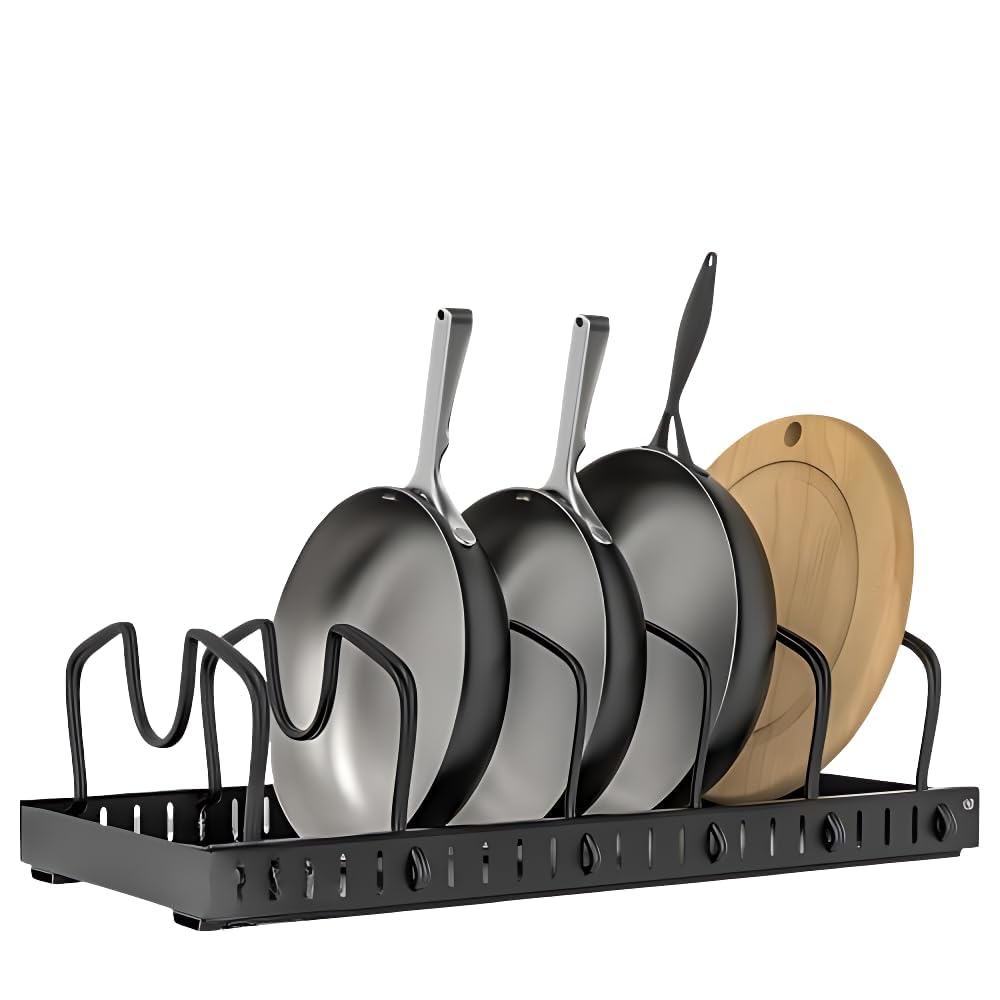 Breewell Under Cabinet Pot and Pan Organizer, 8-Tier Sliding Adjustable Pan Organizer and Pot Lid Holder, Pull Out Pot Lid Organizer for Cupboard, Kitchen Cabinet.This lid organizer for pots and pans is made of thickened titanium steel for long lasting use. The pot and pan organizer for under cabinet holds lightweight pots and pans from 6-10 inches and fits most cabinets and countertops. Please measure your cabinets before purchasing, please make sure the cabinets are wider than 10 inches, deeper than 20 inches and higher than 12 inches. 8 adjustable dividers, you can adjust the width of each compartment to accommodate different sized pots and lids. It can hold pot and pan lids, frying pans, cutting boards, cookie sheets, frying pans, dishes, bakeware, cast iron pans and more. It is specially designed to maximize your kitchen space and create a tidy environment in your kitchen cabinets. With sliding rails and integrated pulley balls, this pot rack allows easy access and storage of your kitchen utensils. Just pull it gently, and you can store or pick up your pots and pans without squatting or searching your cupboards.