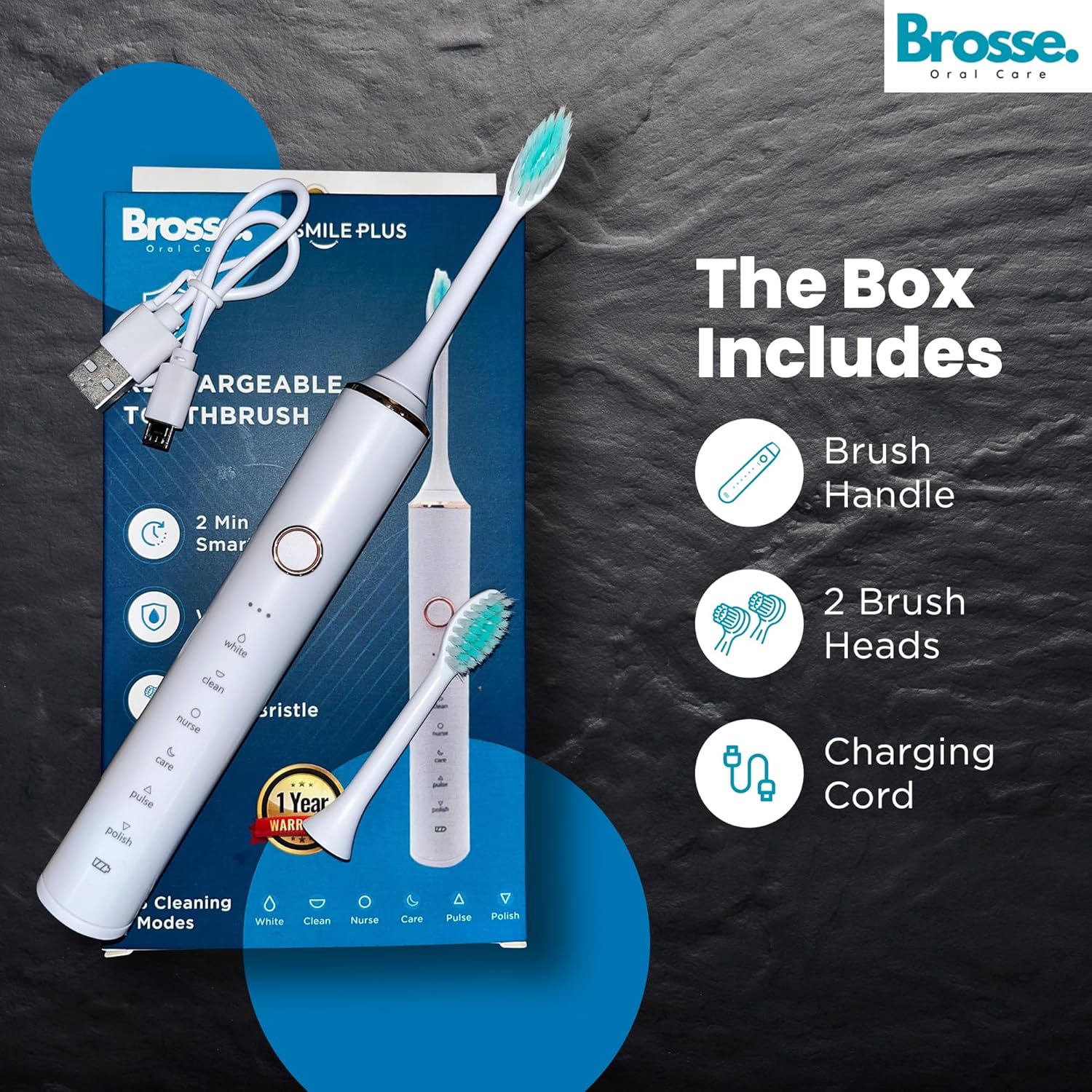 VALUE FOR MONEY ELECTRIC TOOTHBRUSH WITH 1 YEAR WARRANTY : The Brosse. Smile Plus electric toothbrush comes with 37000 strokes/min with an effective, upgraded smart technology for effective cleaning. The soft & round bristles lead to healthy gums, plaque removal, and cleaner teeth within two weeks of use.