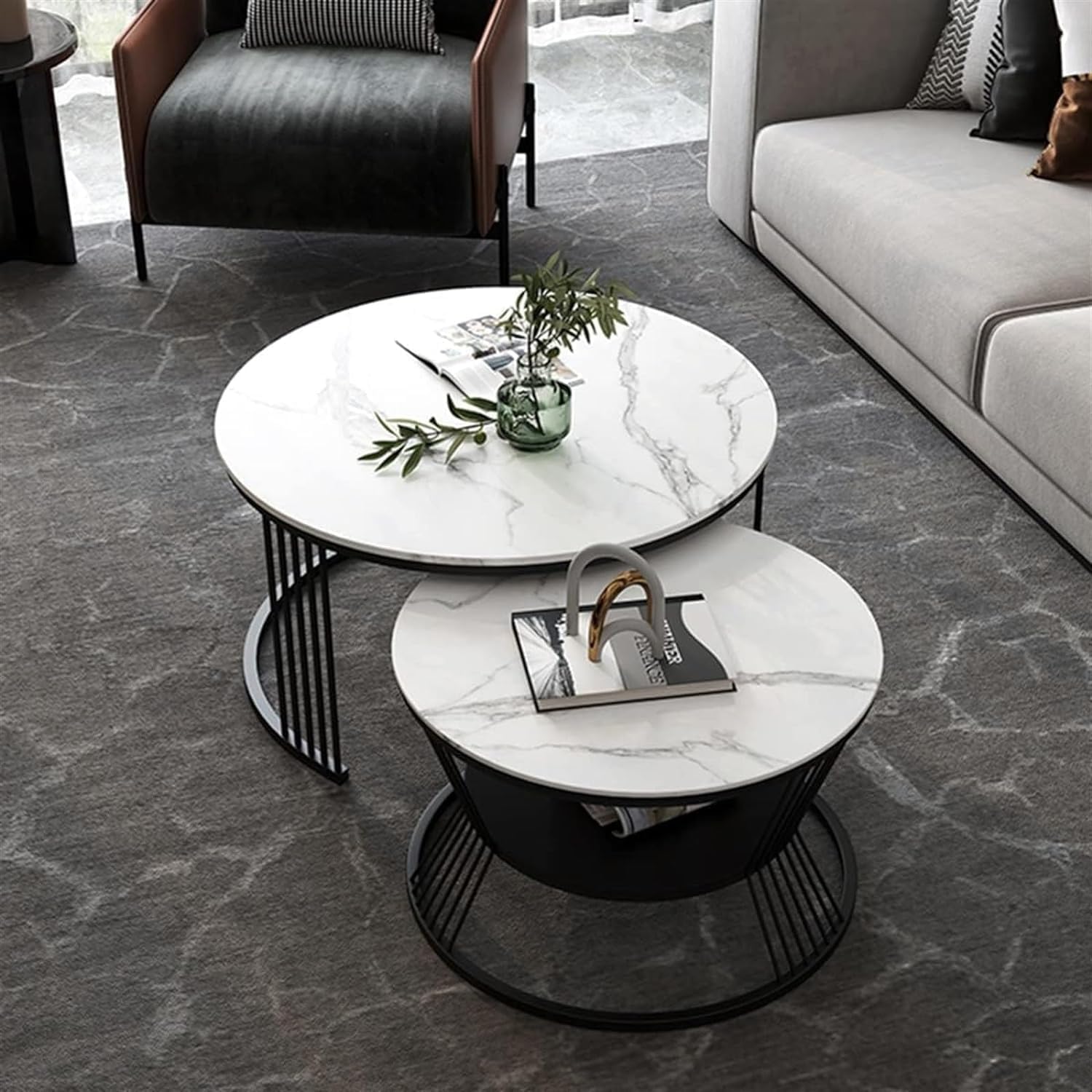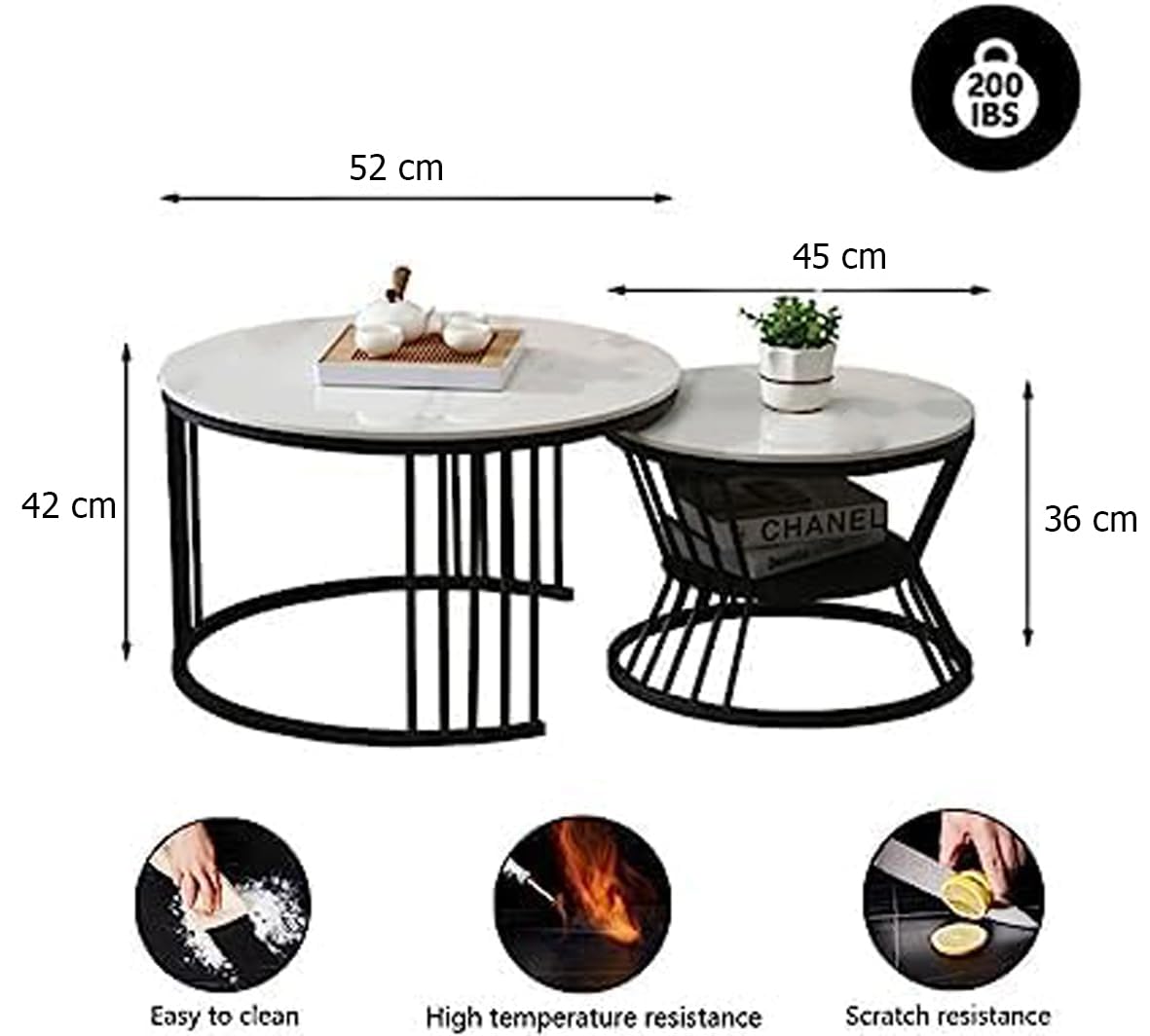 Elegant round nesting coffee table setPremium engineered faux marble wood top with smooth finishSturdy metal frame for long-lasting durabilitySpace-saving nesting design for compact storageModern and minimal design to match any décorScratch-resistant and easy-to-clean surfaceStrong base ensures stability and balancePerfect for living room, bedroom, or office useIdeal for serving, décor display, or daily useLightweight and easy to reposition