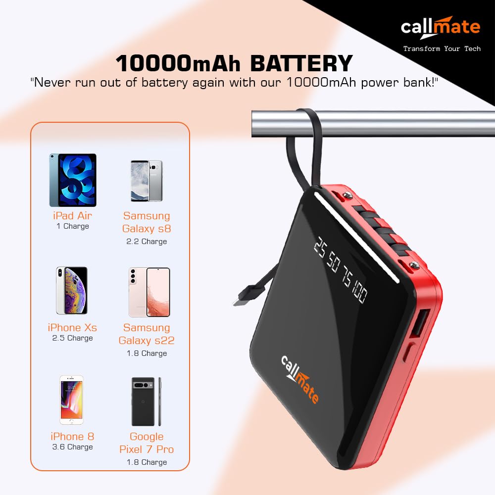 Callmate 10000mAh Power Bank,15W Fast Charging| Buit-in 3-in-1 Cables | 4 Output Ports and 2 Input | Digital Display | LED Torch| for iPhone, Smartphones & Other Devices (Red, Lithium Polymer)