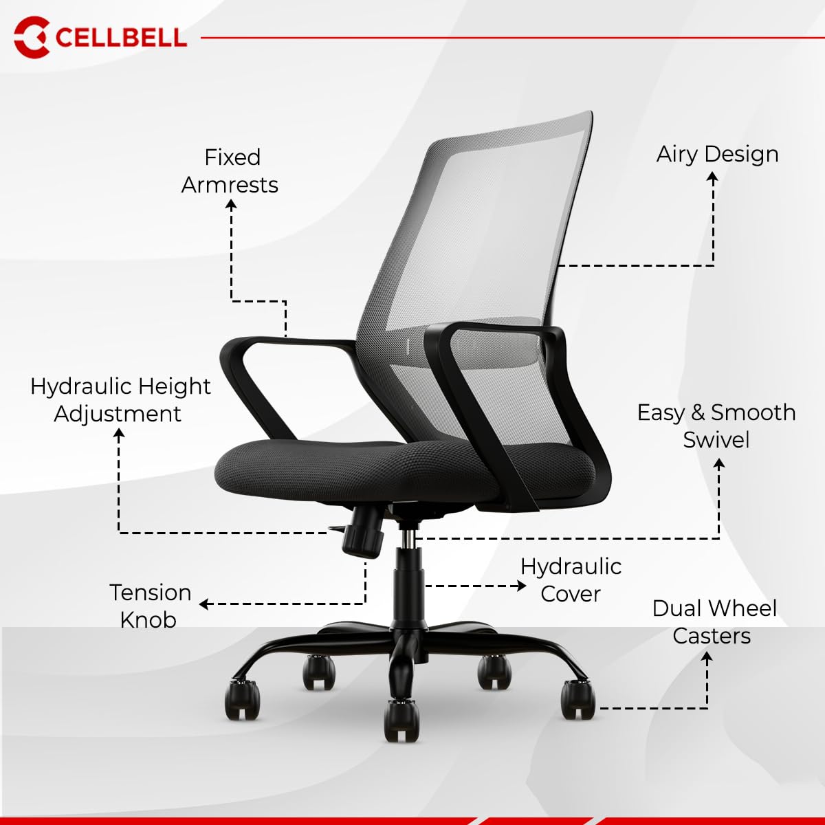CELLBELL Desire Pro Mid Back Mesh Office Chair Adjustable Study Chair/Computer Chair with Revolving Seat, Stylisk Backrest, Lumbar Support, Metal Base for Work from Home (Grey)
