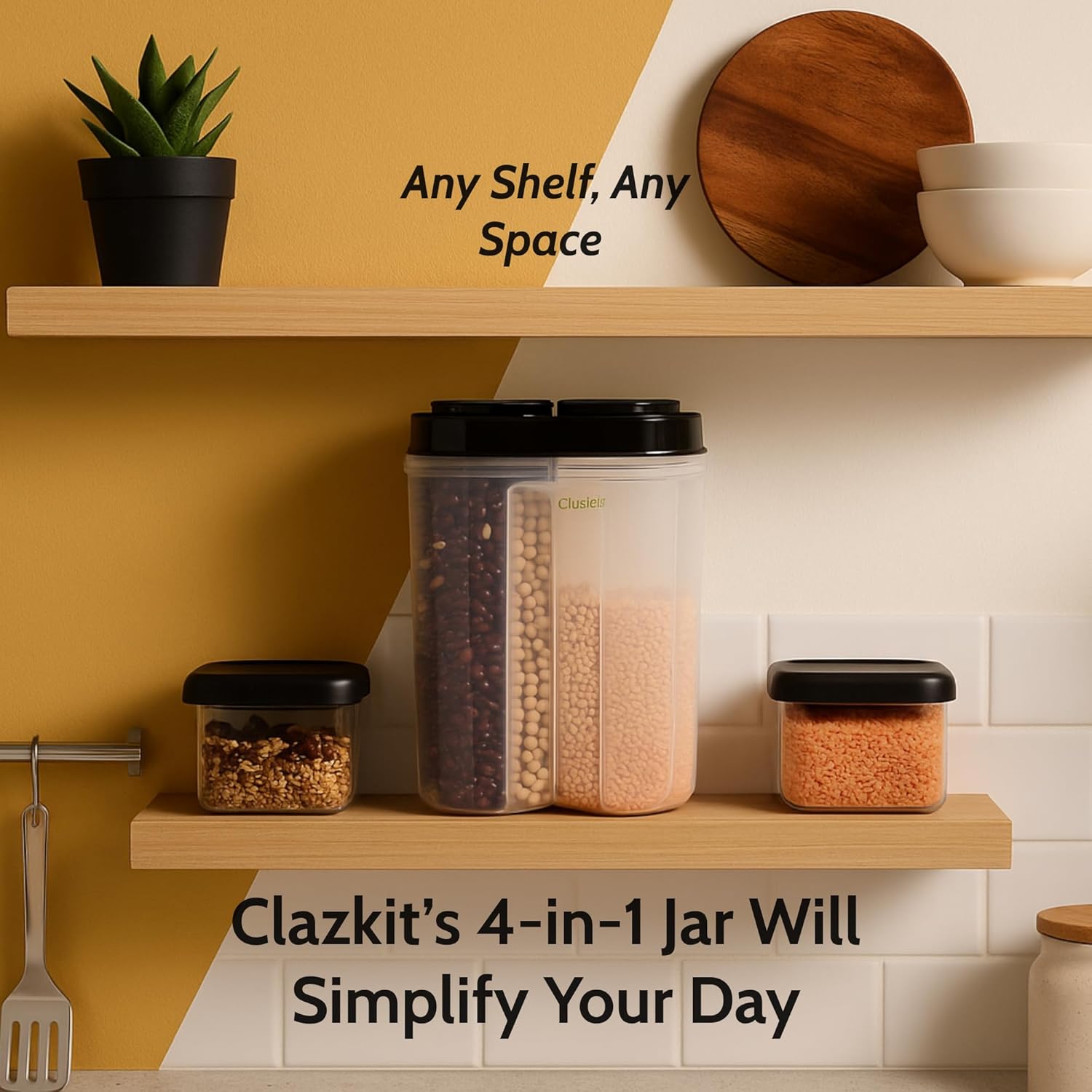 Airtight Transparent Plastic Lock Food Storage 4 Section Container Jar for Grocery, Fridge Container & Containers, Kitchen Storage Box & Container Set for Sugar, Coffee, Rice.4 Section container is made from 100% food-grade PP plastic which is BPA-free. This airtight container is designed to be odor-free, thus keeping the aroma and taste of your stored items intact. You can store a variety of foods ranging from cereals, spices, dry fruits, pulses to salt, sugar, snacks etc. in the jars. This 4 Section container have individual 4 sections in one container, so that you can store 4 different food items in one container without mixing one with each other.These food containers are the perfect way for you to store anything from cereal, flour snacks, and beans to coffee, sugar, tea – or anything else you’d like. Also, this container is a space saver for your kitchen cabinet. It can be used to store various food items as per your wish.