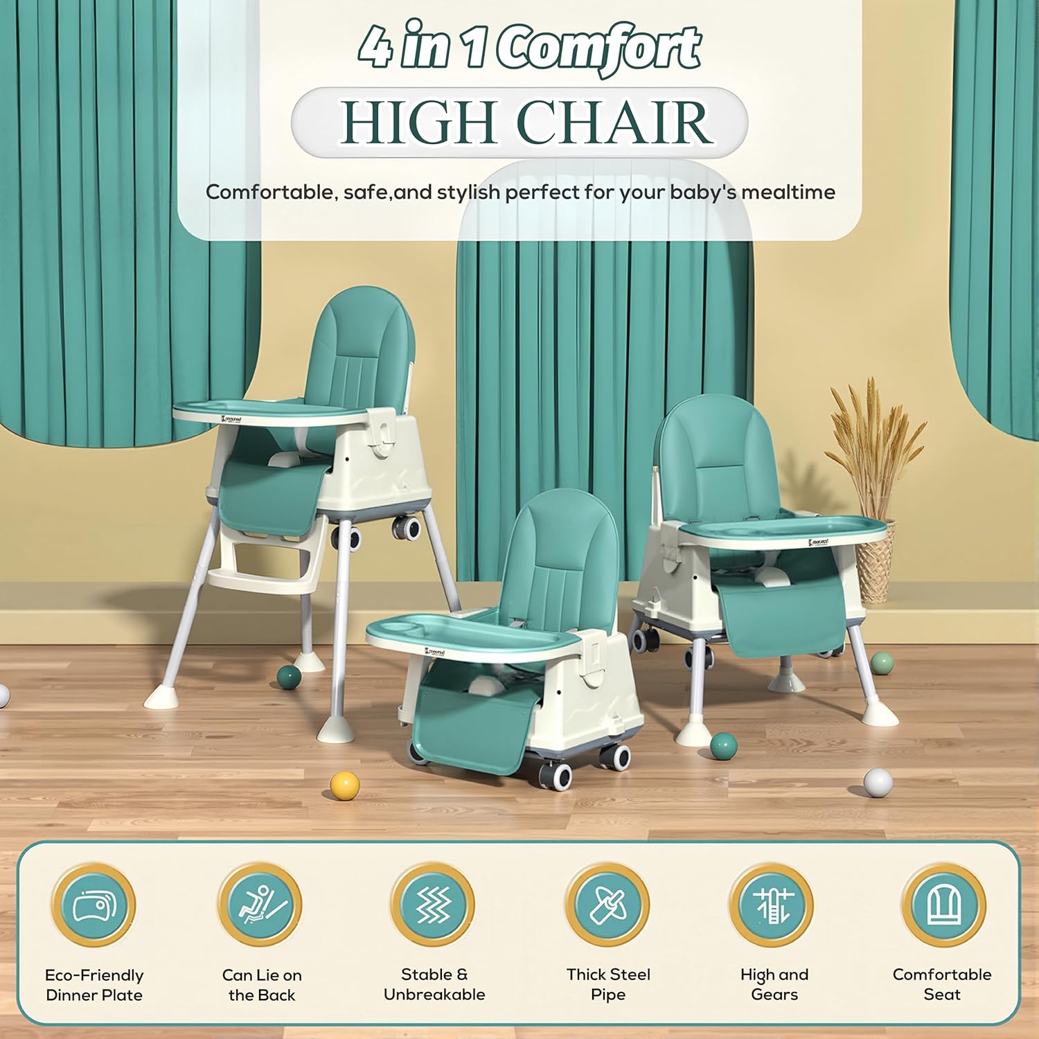 Cockatoo-Kids BiteBuddy 3-in-1 Foldable Baby High Chair with Double Removable Tray, Booster Seat & Wheels, Adjustable Feeding Chair for Kids, Anti-Slip Legs, 3-Point Harness – 3M to 5Y, 40kg Sea Green