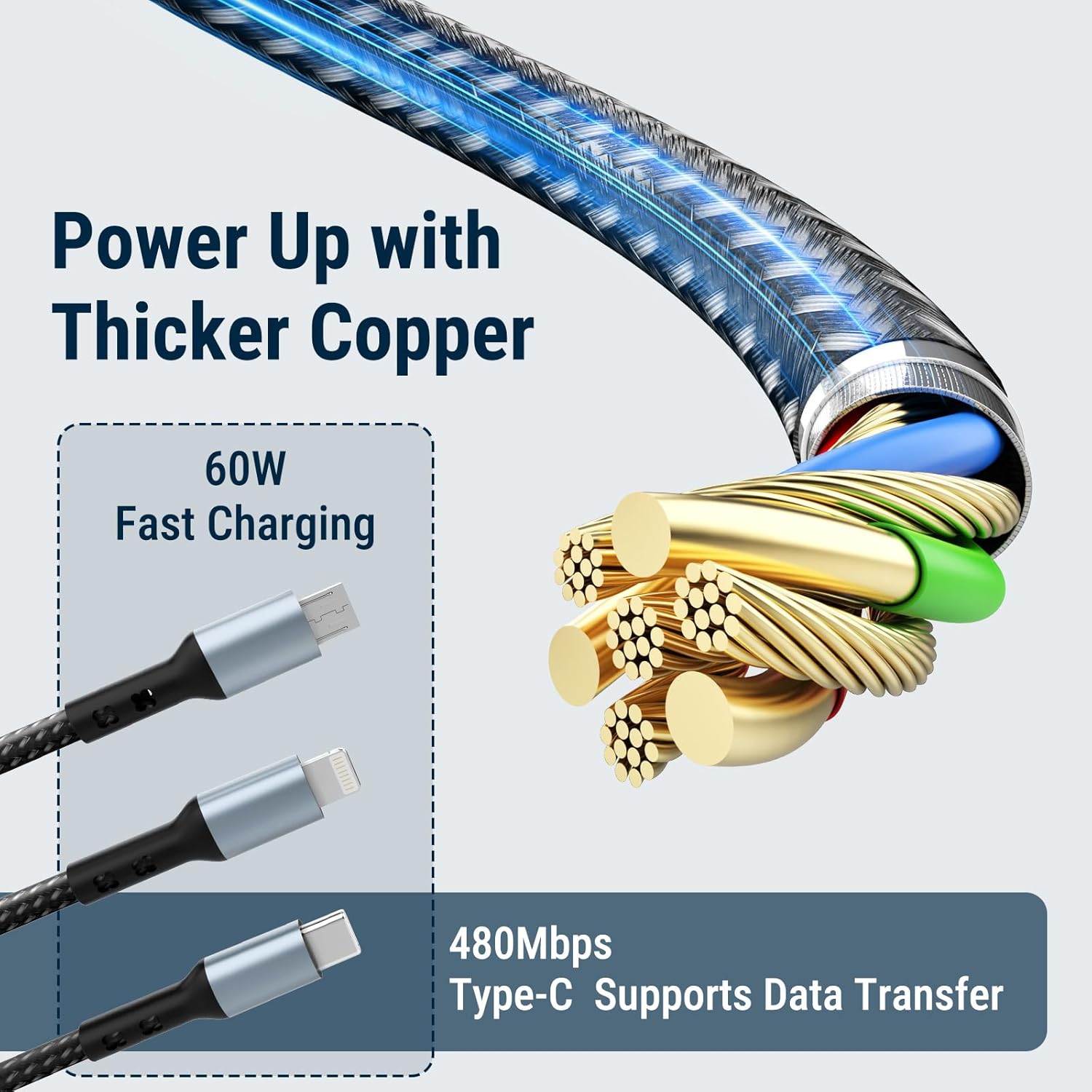 COSTAR 60W 3-in-1 Multi Fast Charging Cable – 3A Nylon Braided 1.5M Cable with Type-C & Micro USB for iPhone, iPad, Samsung, OnePlus, Xiaomi, Oppo, Vivo, Android & Car Charging (Black)