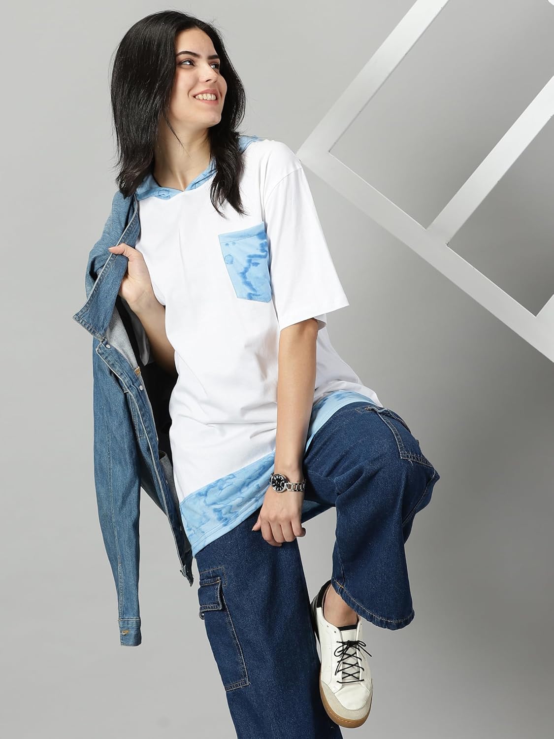 This is hooded neck oversized printed t-shirt that features a hooded neck, half sleeves and front pockets. Take a step towards easy, casual style with Diversify wide range of women’s clothing.