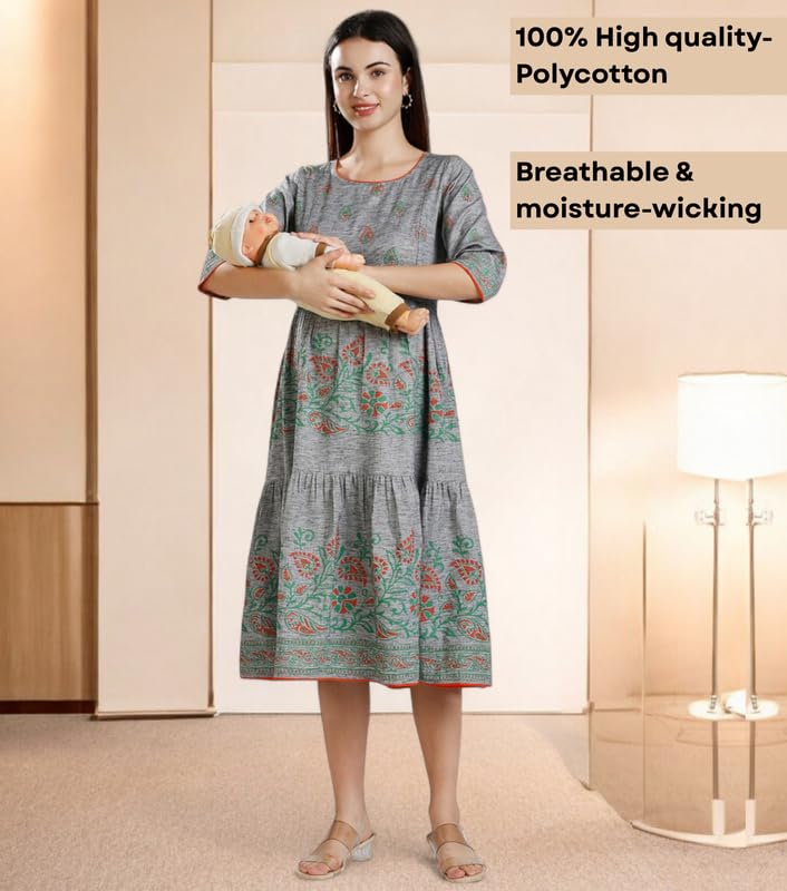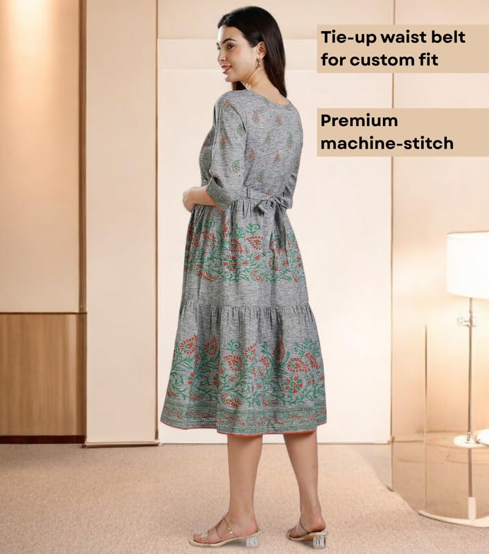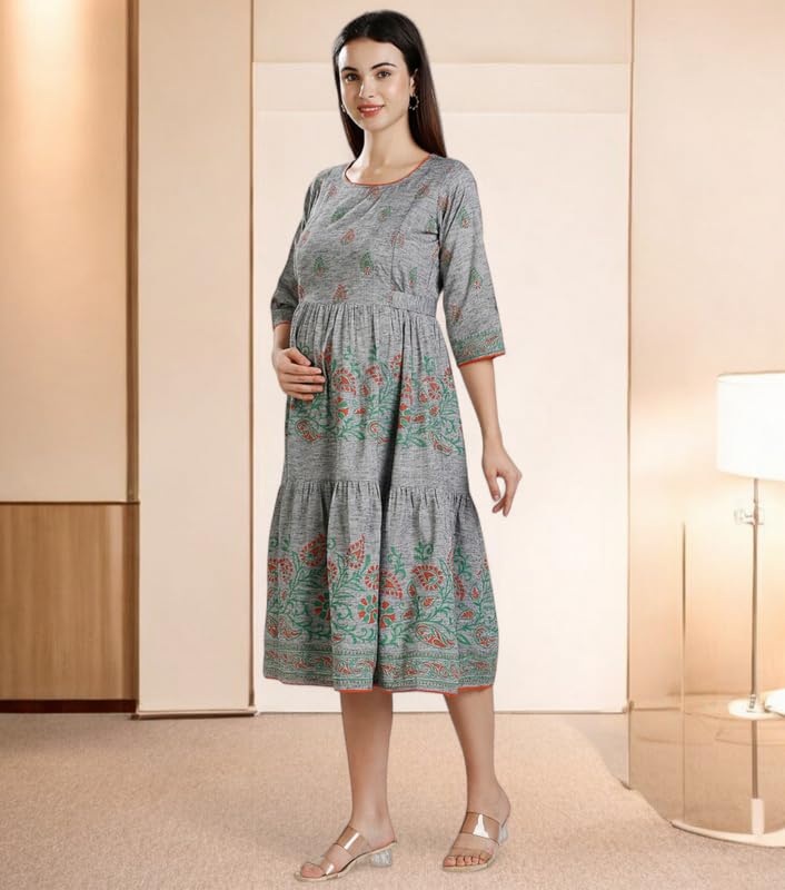 DUMMY SHAPE Maternity Dresses for Women Cotton | Printed Rayon Feeding Flare Kurta with Dual Nursing Zippers to Pre & Post Pregnancy | Baby Shower Gifts for Mom