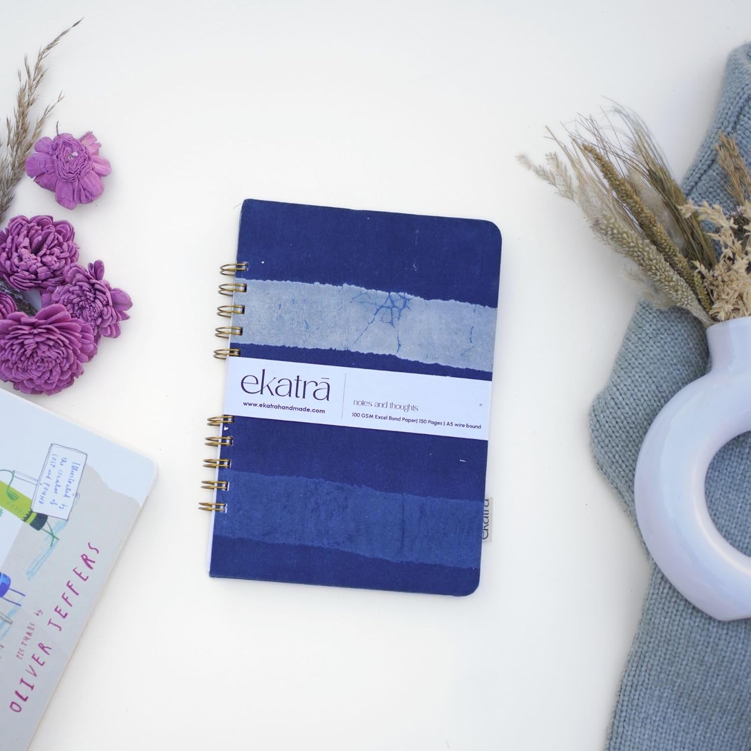 Ekatra A5 Spiral Bound Journal | Handcrafted 100 GSM Paper Notebook | 180 Ruled Pages | Indigo Stripes Fabric Cover | Sustainable Wire-Bound Diary for Notes & Daily Use