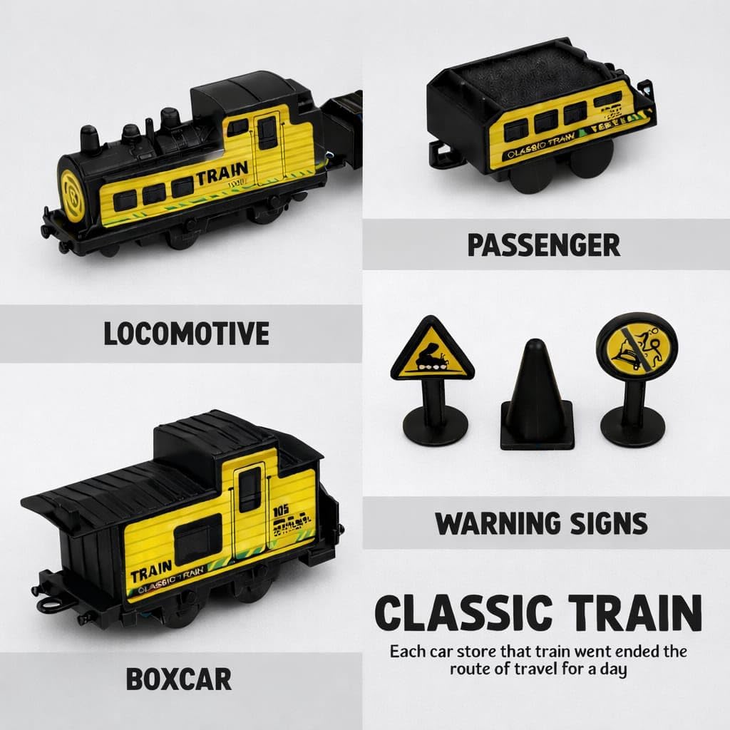 Complete Train Set – Includes 1 Express Engine, 1 Coal Wagon, 1 Passenger Coach, curved and straight tracks, and accessories (14 pieces total).