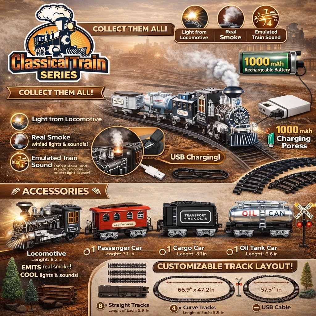 Realistic Train Set:- Includes locomotive with smoke, sound, and light effects for a lifelike railway experience.