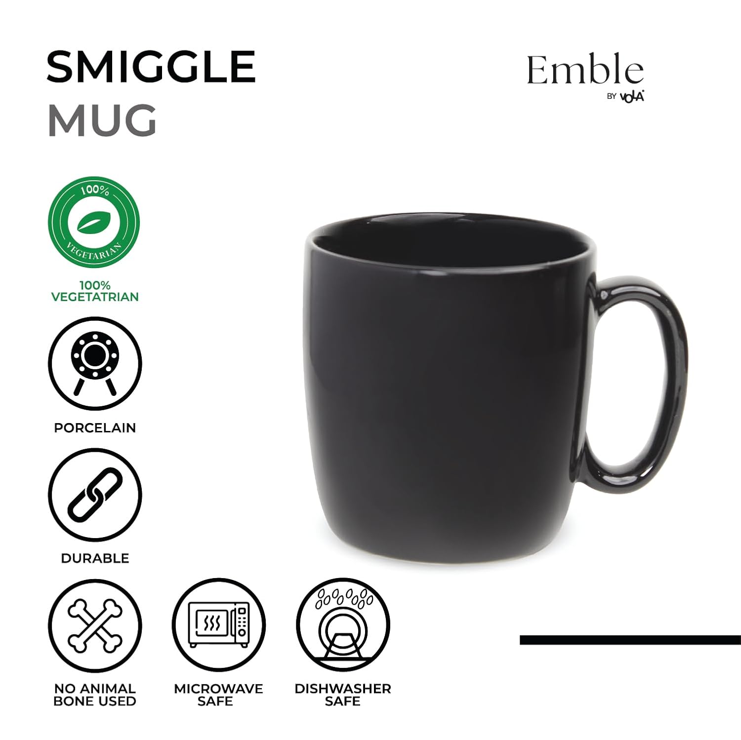 Emble Smiggle Black Ceramic (Porcelain) Premium Tea & Coffee Mug-240Ml Microwave Safe | Home & Office Use | Kitchen & Dining Luxury Tableware | Ideal for Gifting |