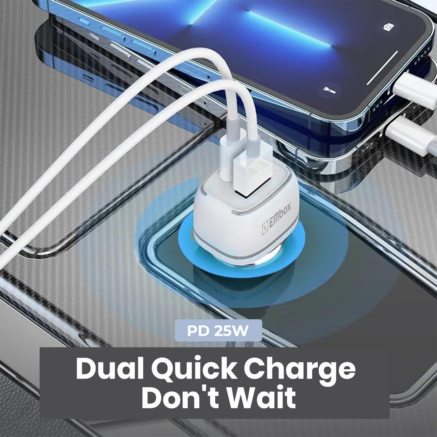 Fast Car Charger: The EmboxCar Power 17W car charger, delivers fast charging speed through dual ports Type C & A USB Ports with a max total output of 17 watts, ensuring compatibility with most car models.