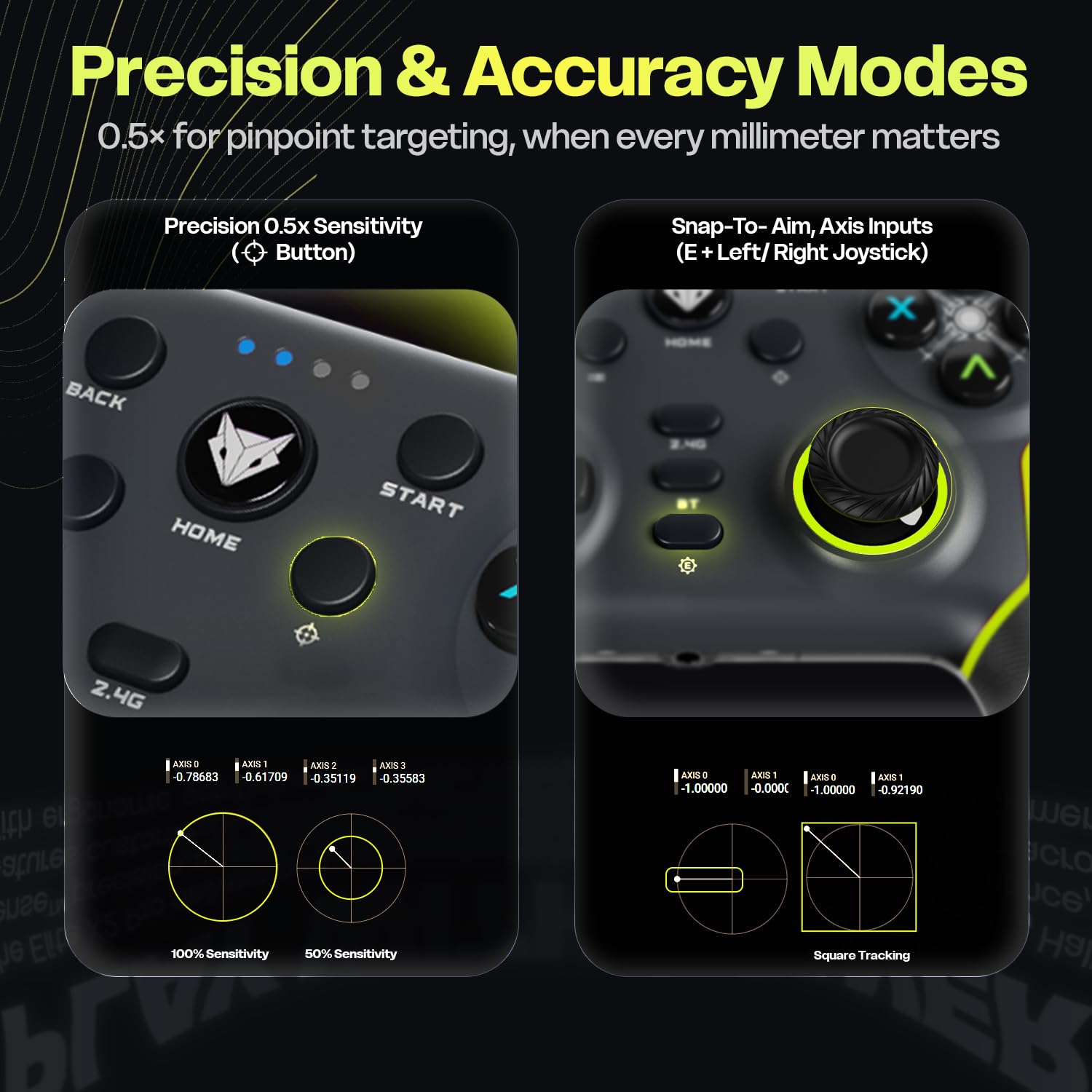𝗣𝗿𝗼-𝗟𝗲𝘃𝗲𝗹 𝗣𝗿𝗲𝗰𝗶𝘀𝗶𝗼𝗻 & 𝗔𝗰𝗰𝘂𝗿𝗮𝗰𝘆 𝗠𝗼𝗱𝗲𝘀 – 𝗦𝘂𝗿𝗴𝗶𝗰𝗮𝗹 𝗖𝗼𝗻𝘁𝗿𝗼𝗹 Precision Mode: Halves joystick sensitivity to 0.5× for pinpoint targeting and micro-adjustments—ideal when every millimeter matters. Accuracy Mode: Activates square movements on the X and Y axes to eliminate diagonal drift, delivering clean, linear inputs for flawless tracking and snap aiming.