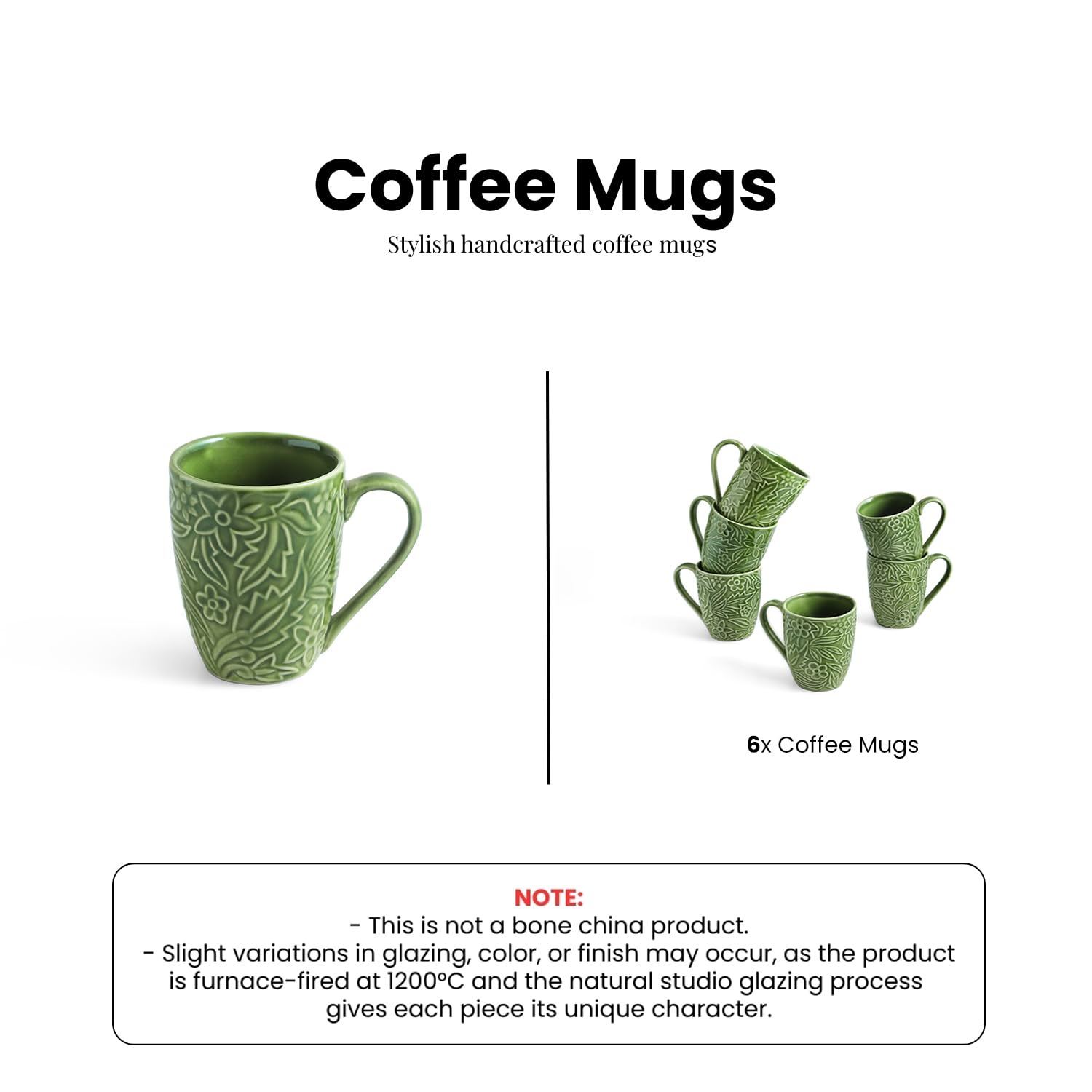 These ceramic coffee mugs are inspired by flowers and leaf patterns and a calming green palette. FEATURES: – Hand-Embossed By Indian Artisans. – These ceramic coffee mugs are inspired by flowers and leaf patterns and a calming green palette. – Depicts beautifully hand-embossed in flower & leaf pattern is on coffee mugs. – Ideal for having tea & coffee or milk with your loved ones. – These are lead free & food safe. – Perfect gifting option for house warmings and the festive season. – The coffee mugs are in tapered cylindrical shape. – This product is a part of the collection ‘Morning Rituals’. – Comes in green and white colour. – The coffee mugs are microwave & dishwasher safe. ART TYPE: Hand-Embossed MATERIAL: Ceramic DIMENSIONS: (L * W * H) = (11.7* 8.1* 10.5*) cm COLOUR: Green & White WEIGHT: 667 grams PACKAGE CONTENT: 2 Coffee Mugs CARE INSTRUCTIONS: 1. Handle with care. 2. Use Mild Detergent and sponge for cleaning. 3. Avoid using any Abrasive material on the ceramic.