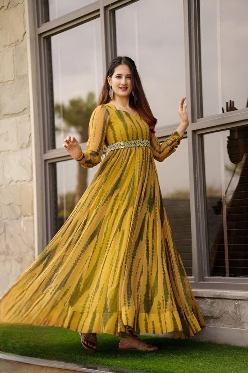 Make a striking statement with this stunning tie-dye maxi dress in vibrant hues. The dress features an elegant floor-length silhouette that creates a graceful flow with every movement. The distinctive tie-dye pattern creates vertical streaks that add visual interest and elongate the silhouette. The dress is beautifully detailed with long balloon sleeves that add a touch of drama and contemporary flair to the traditional maxi dress design. At the waist, an ornate embellished belt creates definition and adds a sparkle of glamour to the ensemble. The round neckline and comfortable fit make this dress perfect for both festive occasions and elegant evening events. The dress combines traditional aesthetics with modern styling, making it a versatile addition to your wardrobe. Pair it with delicate jewellery and sandals for a complete look. This maxi dress is ideal for various occasions, from formal gatherings to festive celebrations.