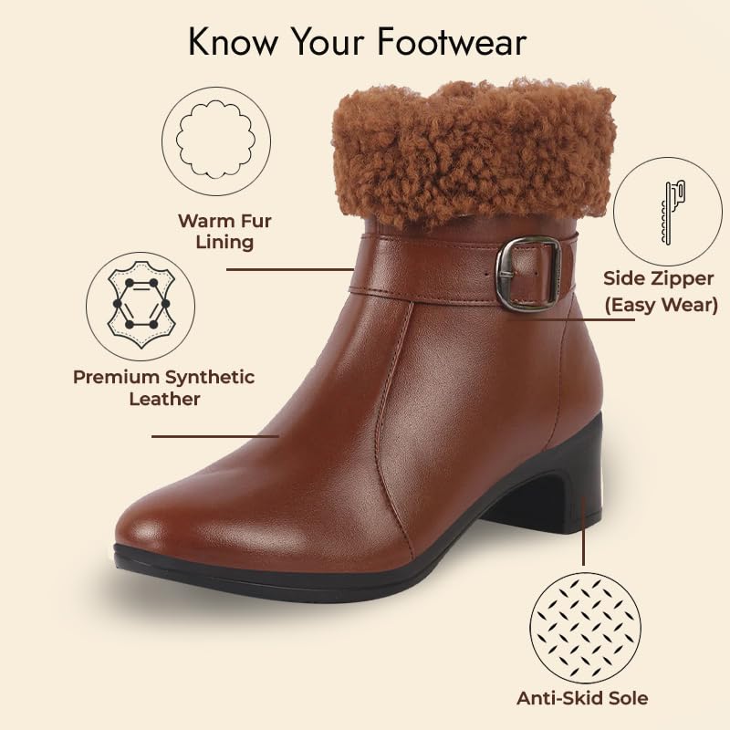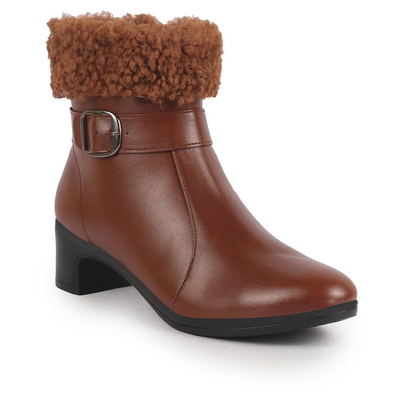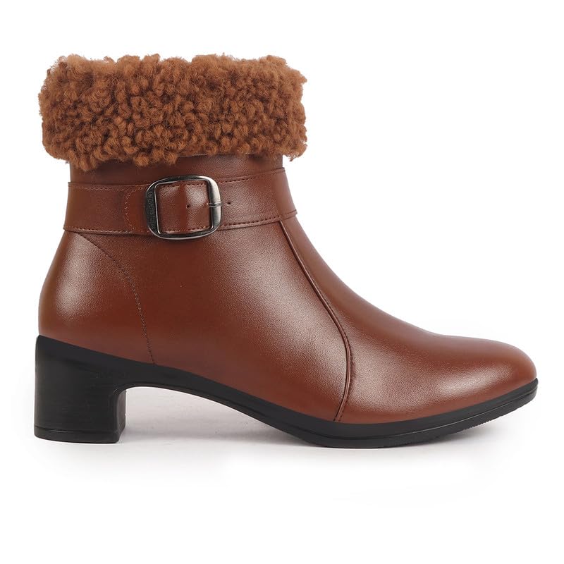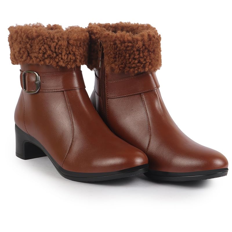FAUSTO Women Flared Heel High Ankle Classic Winter Buckle Strap Side Zipper Fur Boots|Work Boot|Western Dress Boots