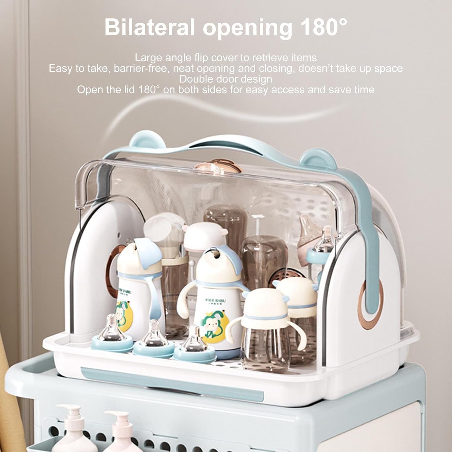 Transparent Dual Flaps: Easy visibility and quick access to items.Reinforced Cup Holders: Securely hold bottles upright for faster drying.Integrated Drain System: Draw-out tray makes water removal easy and hygienic.Cute Bear Gold Accent: Stylish and charming touch that blends into any nursery or kitchen décor.