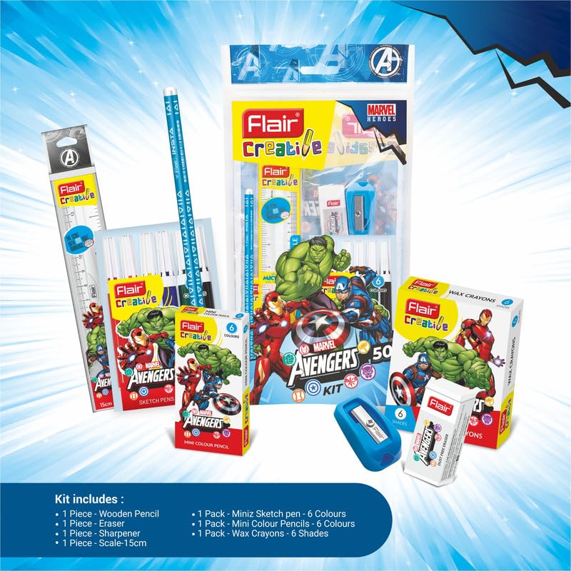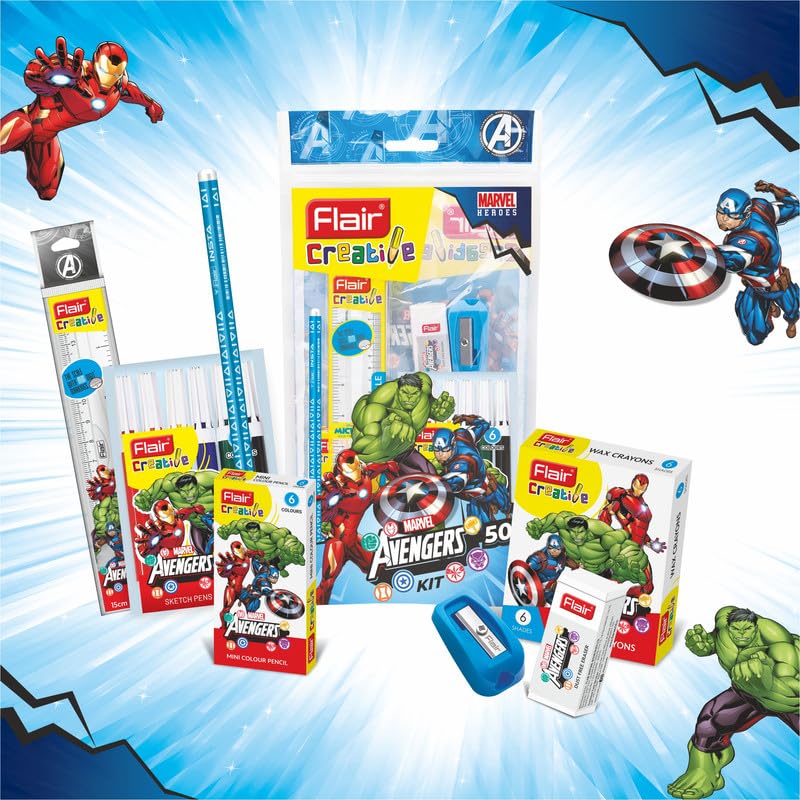 Package Includes: Pack of 3 Marvel Avengers 50 Kit. Each kit includes -1 Piece Wooden Pencil, 1 Piece Eraser, 1 Piece Sharpener, 1 Piece Scale – 15 cm, 1 Pack Miniz Sketch Pen – 6 Colours, 1 Pack Mini Colour Pencils – 6 Colours, 1 Pack Wax Crayons – 6 Shades