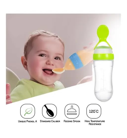 Food Feeding Spoon with Squeezy Food Grade Silicone Feeder Bottle for Infant Baby – 90ml (Green) (Pack of 1)