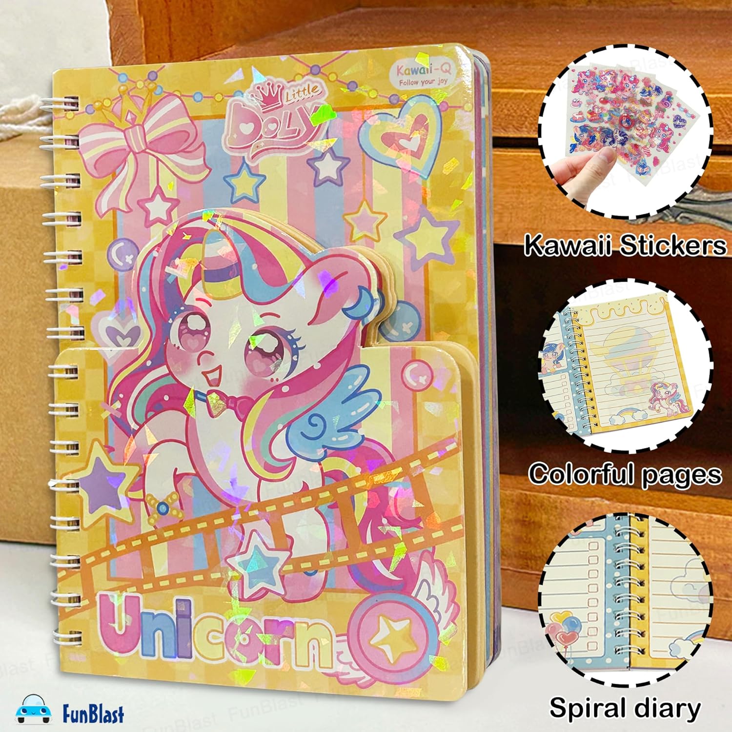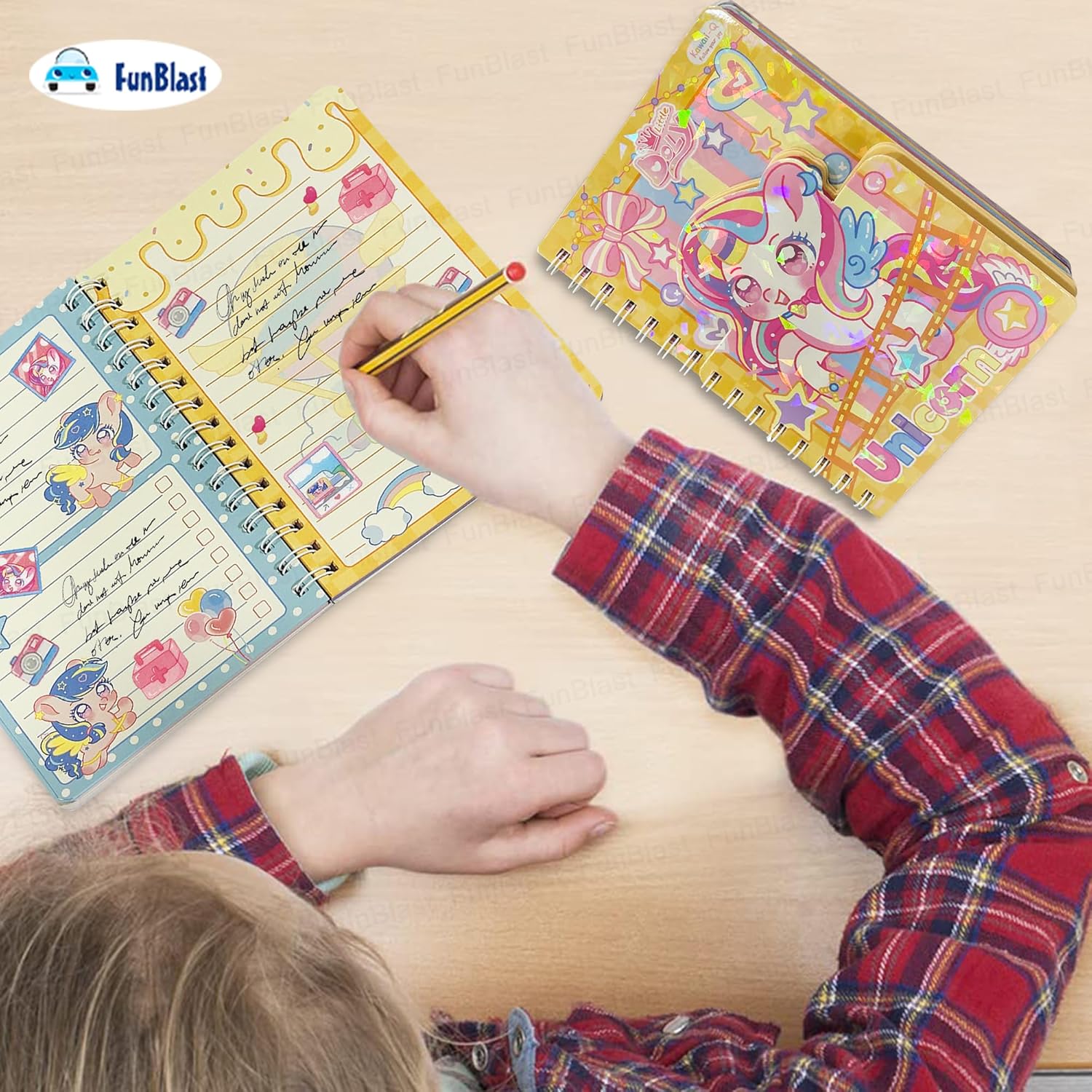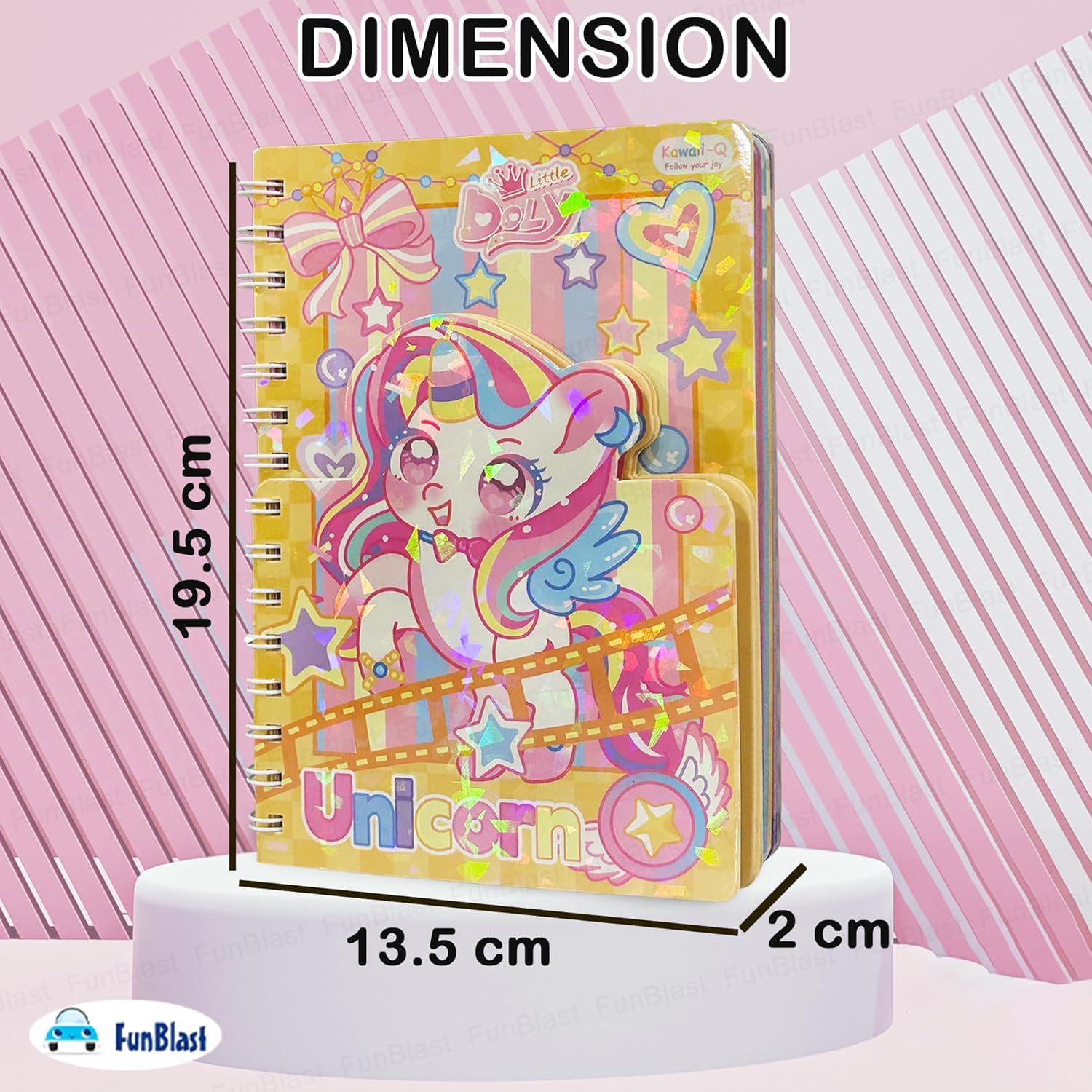 FunBlast Spiral Diary A5 – Cute Unicorn Diary with Kawaii Stickers, Notebook Journal for Scrapbooking, Writing, Notes, Birthday Gift’s for Kids & Adults, Multicolour; 180 Pages FunBlast Cute Unicorn Diary with Kawaii Unicorn stickers – A5 Size, 180 Pages, 4 Sheets of stickers (Approx 80 Pcs) Aesthetic Notebooks for Writing, Journal, Notes, School & Office Use Adorable Kawaii Diary – Set of 1 A5-sized spiral diary with pand design cover kids will love; suitable for school, home, or travel. Compact & Portable – Each notebook measures A5 Size: 19.5 X 13.5 Cm, making them ideal to carry in pockets, backpacks, or pencil cases for on-the-go note-taking or doodling. 180 Colorful Pages – Each notepad contains 90 sheets (180 pages) 70 GSM, of colorful pages, ideal for scrapbooking, note taking, writing or journaling. Lovely and Vibrant PUnicorn Print Cover – The sturdy hard cover allows for easy flipping and flat lay use, enhancing the writing or drawing experience. Best Gift for Kids – Great as party favor, return gifts, rewards, or everyday use for kids; encourages creativity and writing habits in a fun way.