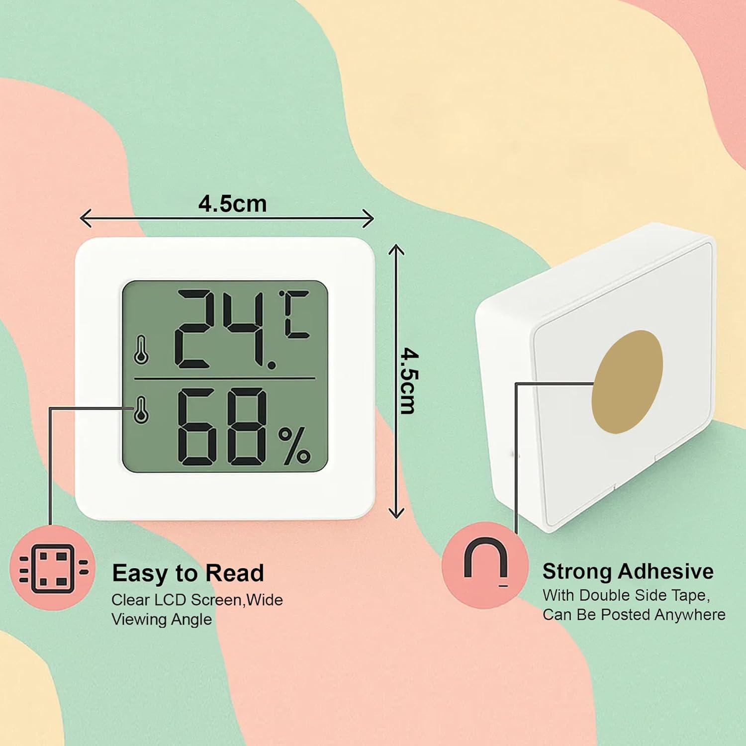 Compact and easy to use, this Small Digital Hygrometer monitors indoor temperature and humidity with accuracy. Featuring a clear LCD and sleek white design, it’s perfect for maintaining a comfortable environment in your home or office.