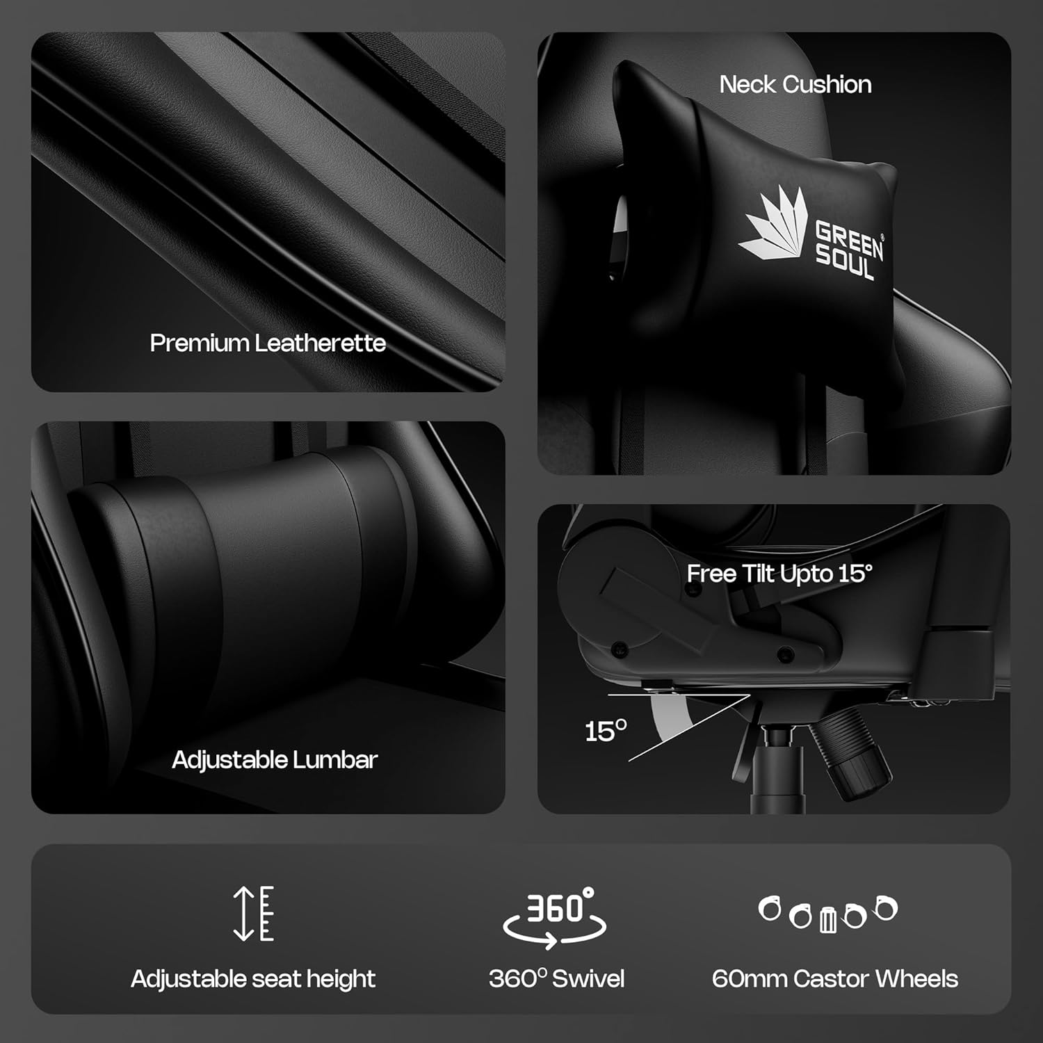 Green Soul Raptor 2.0 Racing Edition Ergonomic Gaming Chair with Premium PU Leather, Adjustable Neck & Lumbar Pillow, 3D Adjustable Armrests & Heavy Duty Nylon Base (Black) Installation Provided