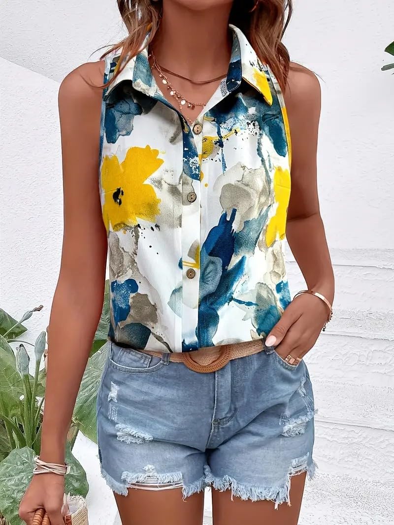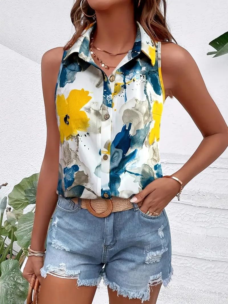 Floral Sleeveless Charm: Crafted to be an easy-to-wear essential, this shirt pairs beautifully with your favorite shorts, skirts, or denim, instantly creating fresh, stylish looks.Vibrant Watercolor Hues: A stunning blend of vibrant blues, cheerful yellows, and subtle neutrals create a versatile palette, ideal for various style statements.Perfect for Every Occasion: Whether heading to a casual brunch, beach outing, or evening stroll, this top is your go-to for a chic, uncomplicated outfit.