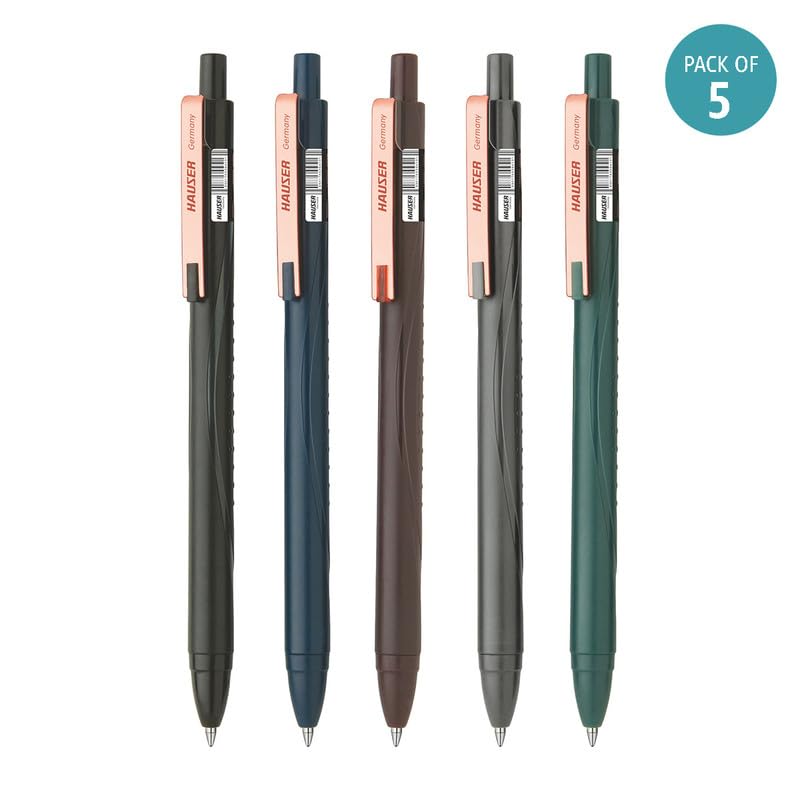 Hauser Germany Enzo Retractable Medium Tip Ball Pen | Minimalistic Ergonomic Body With Copper Color Pocket Clip | Blue Ink, Pack Of 5 – Body Color May Vary