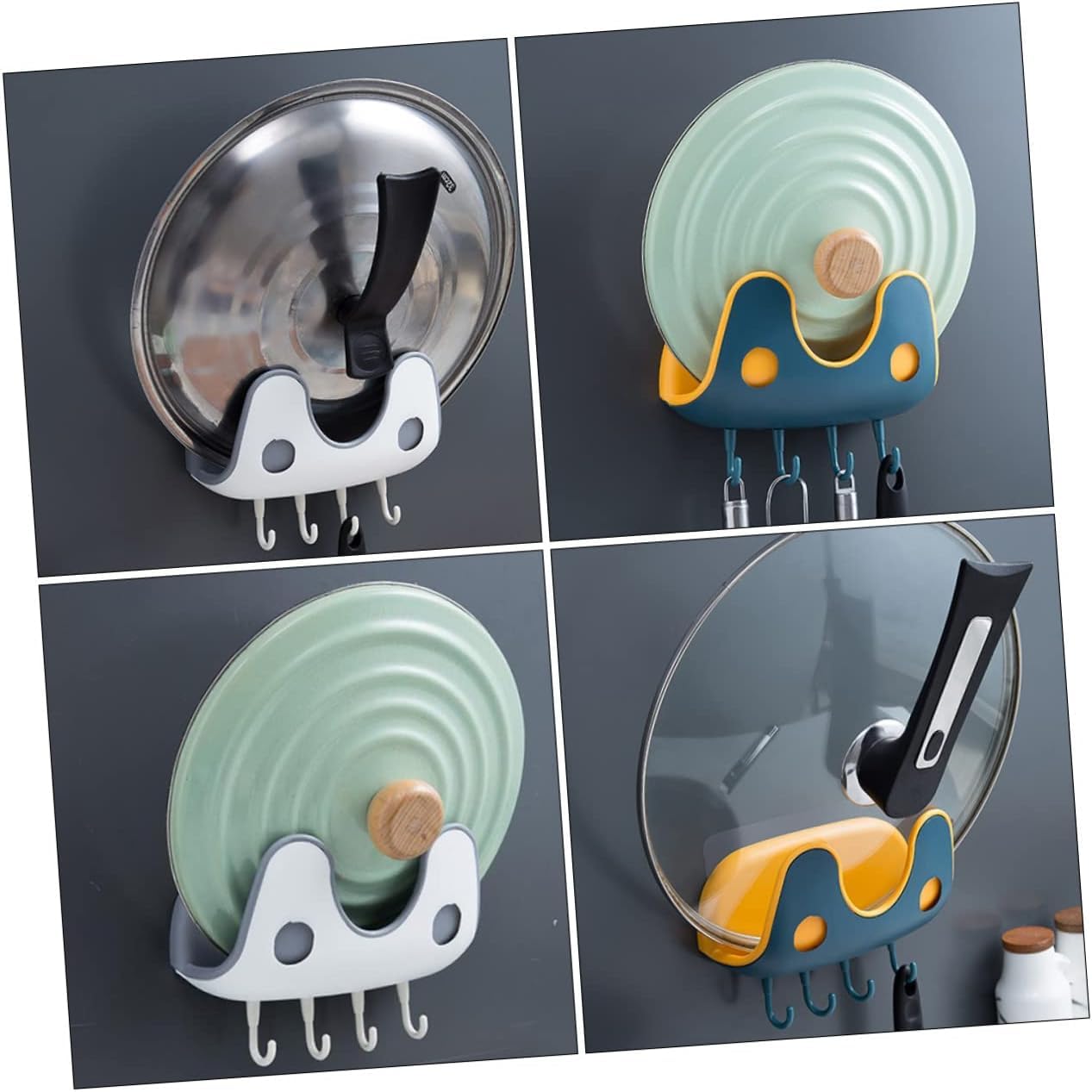 INKAJ Multifunctional Plastic Self Adhesive Pan Cover Lid Holder 4 Hooks Pot Lid Utensil Double Layer Shelf Organizer Rack For Kitchen Towel Clothes Mobile Key Cabinet Door Wall Mounted (White)