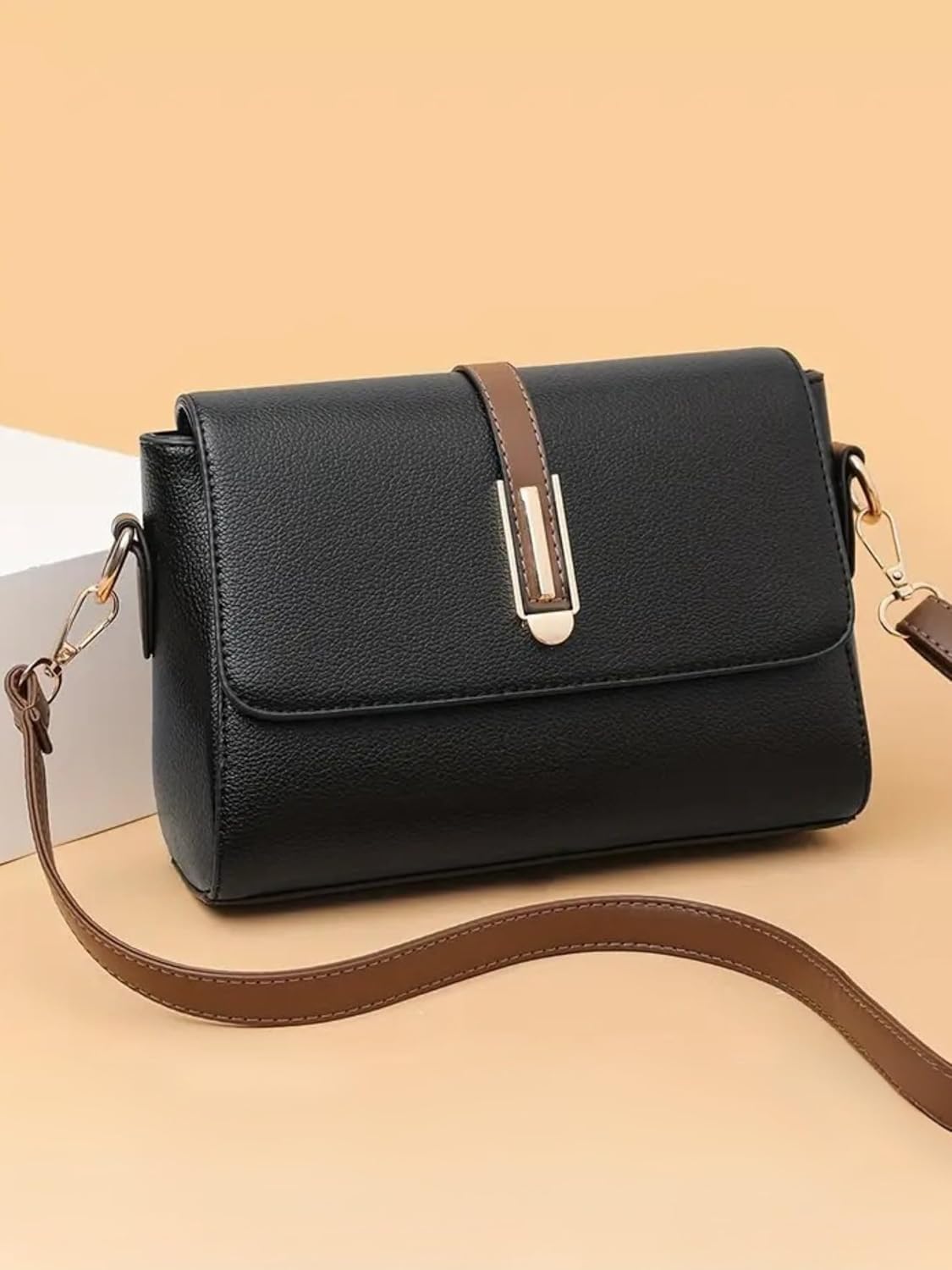 Elevate your everyday style with this sophisticated crossbody bag featuring a timeless design in light beige faux leather with contrasting brown strap and elegant gold-tone hardware. The thoughtfully designed 22 x 16 x 6.5 cm dimensions offer ample space while maintaining a sleek profile. The main compartment, secured with a magnetic snap closure, includes a slip pocket and zipper pocket for organised storage of essentials. A convenient back zipper pocket provides quick access to frequently needed items. The adjustable and detachable strap allows versatile carrying options to suit your needs. Premium details like the decorative gold-tone accents and precise stitching showcase the bag’s refined craftsmanship. Perfect for both casual outings and formal occasions, this handbag seamlessly combines functionality with contemporary fashion. Also available in classic black and deep teal colourways to match your personal style.