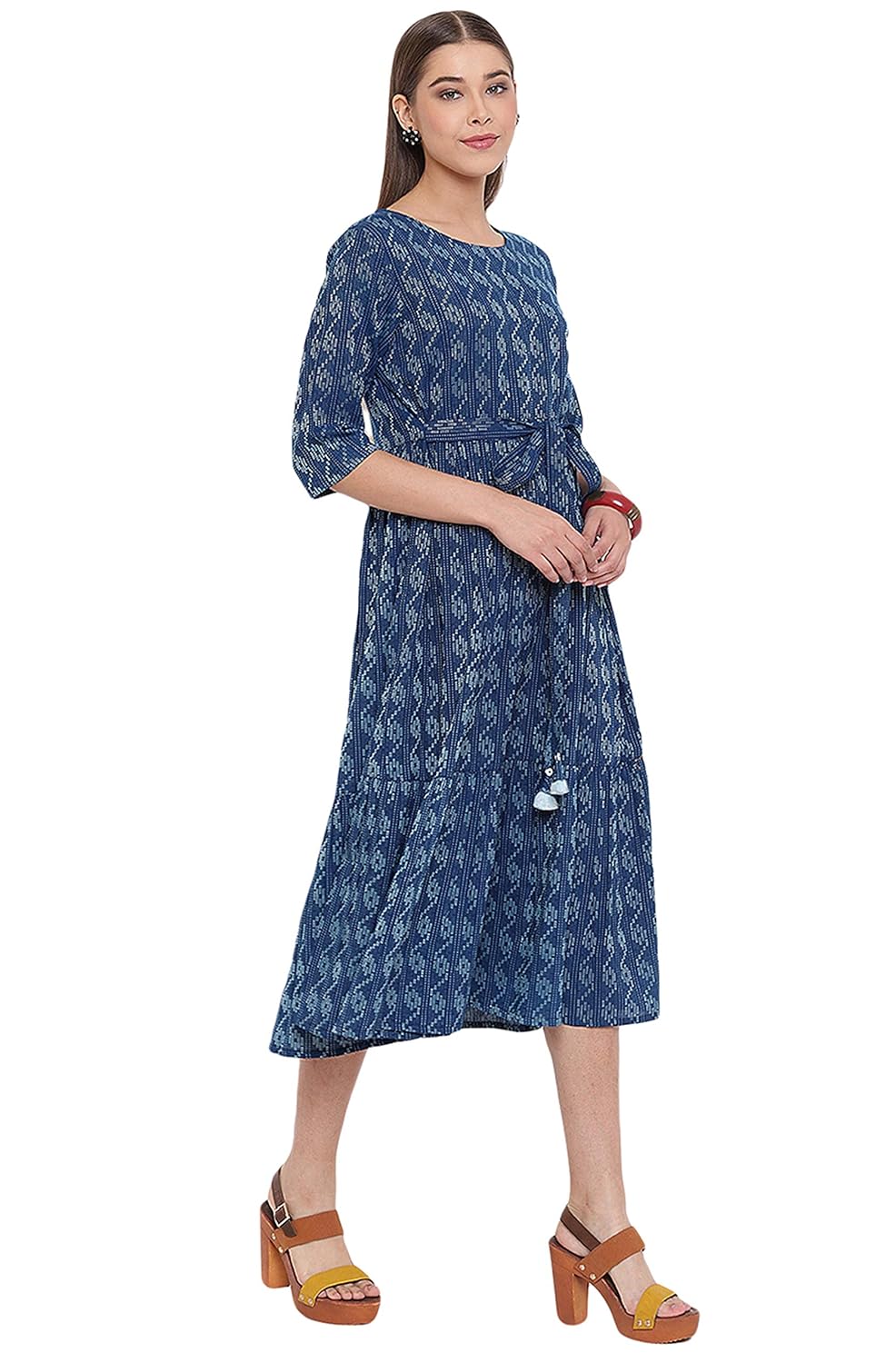 Infuse a dramatic vibe to your everyday wardrobe with this blue dress from Janasya. Fashioned in a fit-and-flare frame with a gathers at hem for chic appeal, the breathable construction features a belt detailing at the waist for a flattering fit. Team it up with kitten heels and statement earrings.
